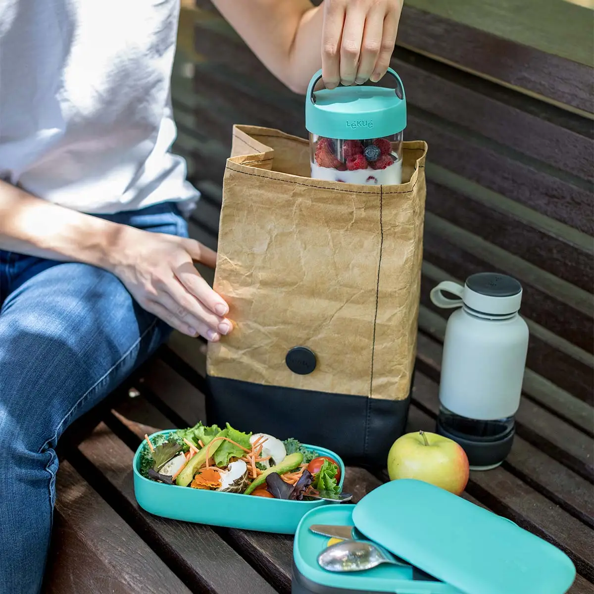 Modna torba lunchowa marki Leuke jest trwała, elastyczna i wszechstronna. Można ją złożyć, dzięki czemu jest łatwa do przechowywania. Dostosowuje się do swojej zawartości. Torba wykonana jest z nowoczesnego materiału tyvek, który z wyglądu przypomina pognieciony papier, ale łączy w sobie zarówno cechy papieru, jak i folii, tworzywa sztucznego i podłoża tekstylnego. Jest wytrzymalszy niż skóra naturalna. Wewnątrz jest wyłożona termoizolacyjnym materiałem, pozwalającym na utrzymanie odpowiedniej temperatury posiłków. Torba pomieści pojemniki z serii TO GO, a także kanapki czy inne przekąski.