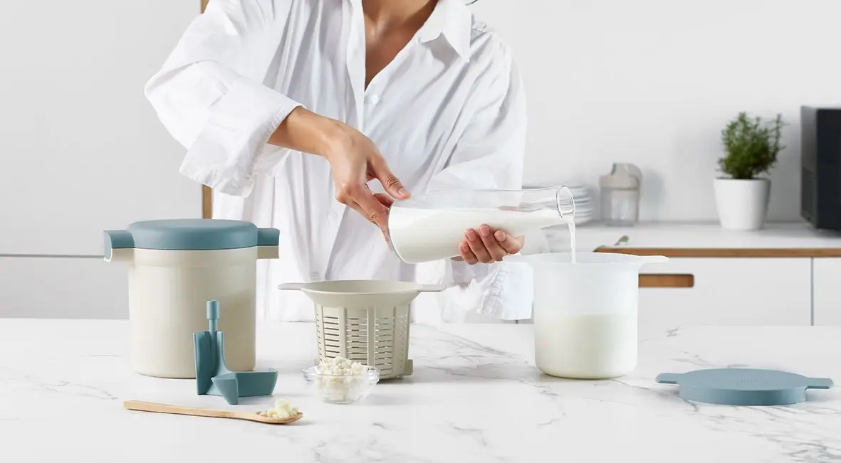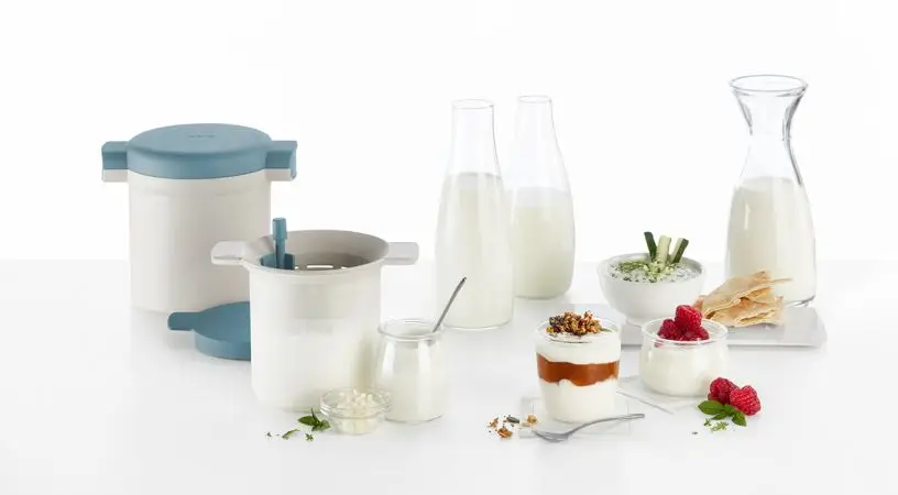 - Innowacyjny projekt Wszystko w jednym! Możesz wykonać cały proces za pomocą tego samego zestawu: podgrzewanie mleka, fermentowanie, filtrowanie granulek, a nawet konserwowanie końcowej partii.
