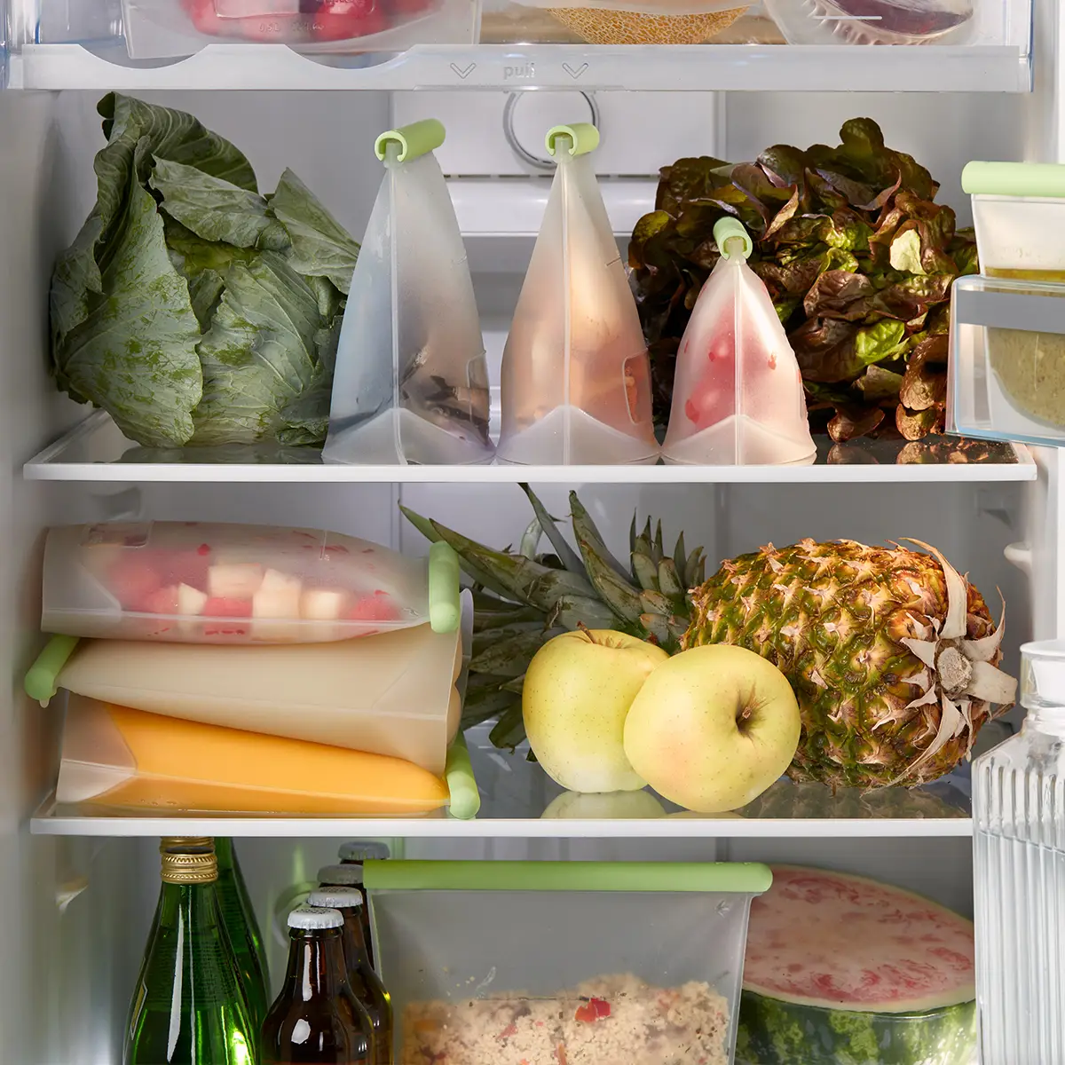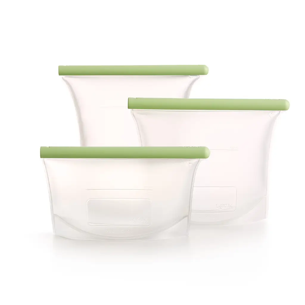 Woreczki sprawdzą się do przechowywania żywności w lodówce, zamrażarce lub na półkach, do rozmrażania produktów w kuchence mikrofalowej (bez klamry uszczelniającej), a także do pakowania produktów sprzedawanych luzem. Specjalna klamra sprawia, że woreczek jest w 100% szczelny i hermetyczny. Pełne woreczki można przechowywać zarówno w pozycji pionowej, jak i poziomej. Na woreczkach wskazany jest maksymalny poziom wypełnienia oraz specjalne miejsce do zapisania daty, pozwalające na kontrolę świeżości produktów. Woreczki są ekologiczną alternatywą dla jednorazowych woreczków śniadaniowych. Produkt wykonany jest z silikonu platinium. Wolny od BPA.