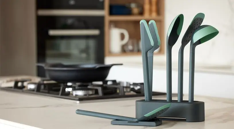 - Ponadto zawiera ekskluzywny uchwyt, idealny do utrzymania przyborów w porządku i na widoku. Gotowy do szybkiego i łatwego gotowania! Innowacyjny, długi i wąski kształt uchwytu optymalizuje przestrzeń na blacie, dobrze wykorzystując narożniki lub ściany. Posiada również tackę podtrzymującą, na której można odkładać przybory podczas gotowania, dzięki czemu blat pozostaje czysty i schludny. Praktyczny dodatek do organizacji kuchni, który stanie się częścią jej dekoracji.
