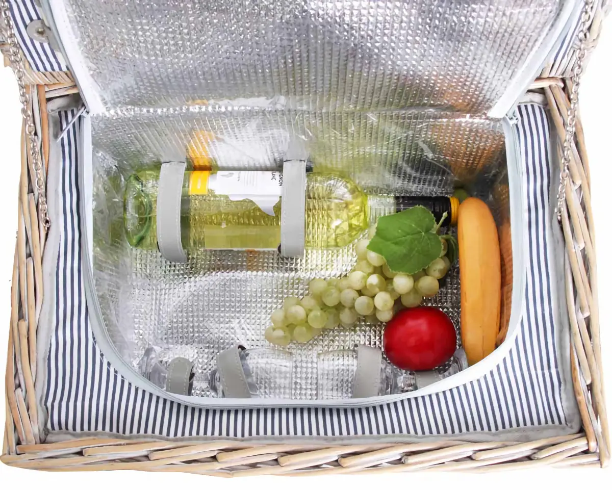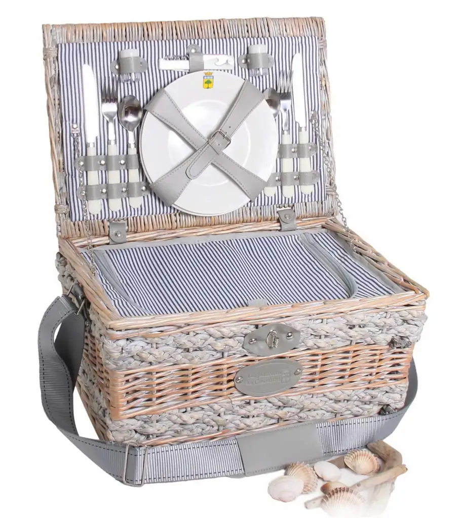 Zamykany paskiem kosz nie tylko elegancko się prezentuje, ale i jest praktyczny. Niewielkie rozmiary pozwalają na łatwe umieszczenie go w bagażniku, a nawet przypięcie do roweru. Umieszczony na górze uchwyt oraz regulowany pasek do noszenia przez ramię ułatwiają przenoszenie. Z kolei znajdujące się wewnątrz dodatkowe paski umożliwiają zabezpieczenie butelki z winem lub napojem. Wyłożone tkaniną w białe paski wnętrze stanowi komorę izotermiczną, która pozwala na zachowanie pożądanej temperatury napojów i żywności. Wyposażenie kosza przeznaczone jest dla 2 osób i zawiera: 2 talerze ceramiczne o śr. 20 cm z wybitym herbem marki, 2 kieliszki o pojemności 120 ml, 2 komplety sztućców z rączkami z białej melaminy oraz akcesoria takie jak korkociąg, solniczka i shaker do pieprzu. Jego niewątpliwą zaletą jest możliwość mycia w zmywarce, co pozwala na wygodne i szybkie czyszczenie. Do kosza dołączona została także mała torba z poliestru, w której po pikniku można przechować brudne naczynia, by resztkami jedzenia nie poplamiły wnętrza kosza.