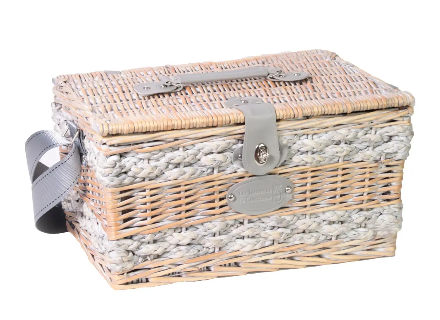 Wykonany z bielonej wikliny i sznurka oryginalny kosz piknikowy Chaumont ma delikatną kolorystykę łączącą biel, beż i niebieski. Produkt wspaniale zaprezentuje się podczas pikniku na polance, plaży czy w przydomowym ogrodzie. Dołączone wyposażenie ułatwi spożycie posiłku na świeżym powietrzu.
