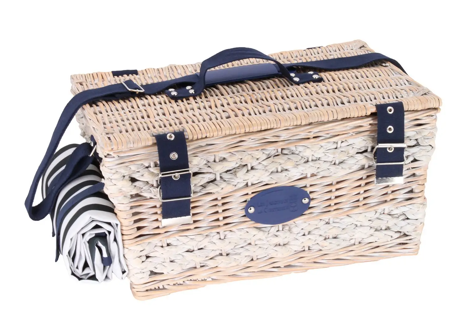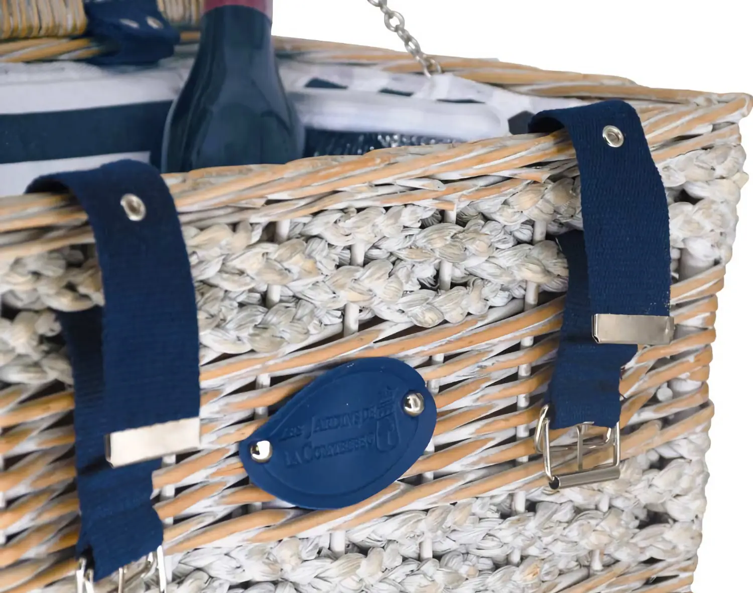 Wykonany ręcznie kosz piknikowy Marine doskonale nada się na piknik na plaży, umilając słoneczny ciepły letni dzień w gronie rodziny lub znajomych. Przeplatające się rzędy sznurków z naturalną, pokrytą białą patyną wikliną, niebiesko-biała tkanina oraz ciemnoniebieskie paski z zapięciami nadają mu egzotyczny, unikalny wygląd, aż zachęcający by spędzić czas blisko morza.