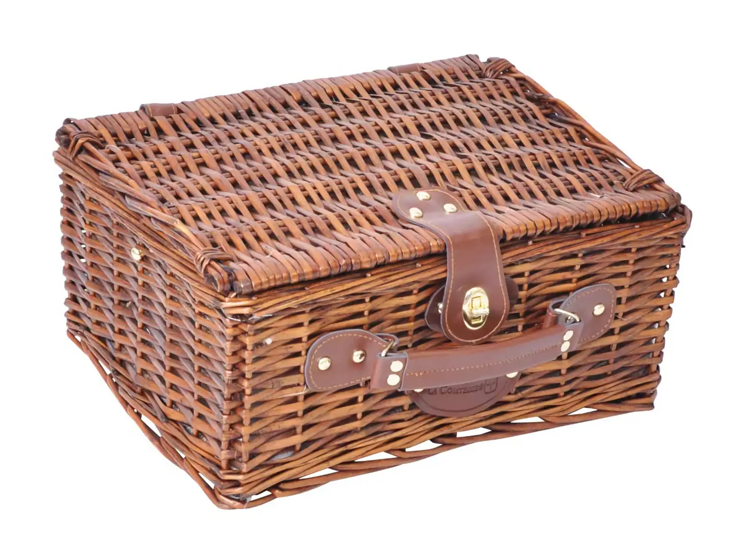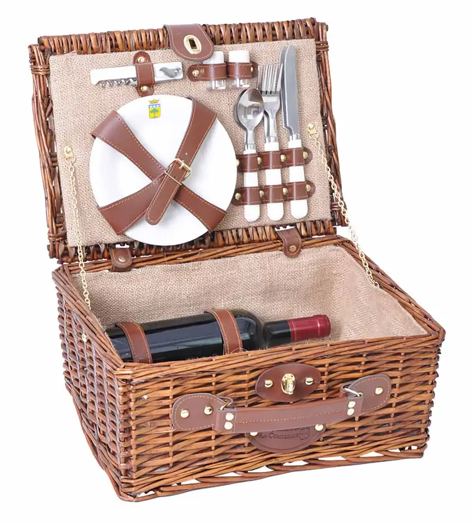Przeznaczony dla 2 osób kosz piknikowy Saint-Michel w brązowo-beżowej kolorystyce idealnie nada się na wspólny piknik we dwoje w ciepły wiosenny lub letni dzień, dzięki dołączonemu wyposażeniu umożliwiając wygodne spożycie posiłków i napicie się wina.