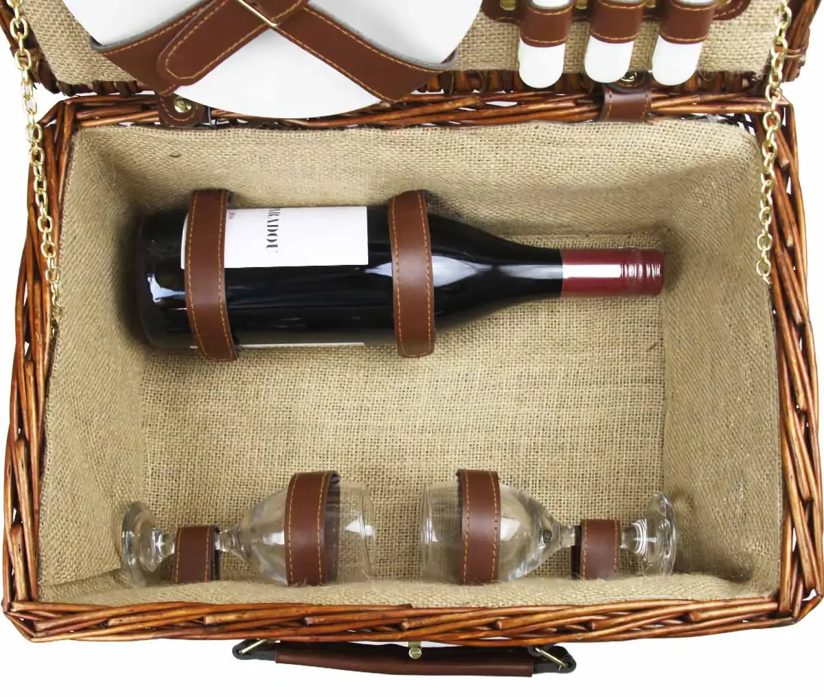Kosz nie tylko elegancko się prezentuje, ale i jest praktyczny. Niewielkie rozmiary pozwalają na łatwe umieszczenie go w bagażniku, a nawet przypięcie do roweru. Można go bez problemu przenosić z pomocą uchwytu. Wewnątrz kosza umieszczono dodatkowe paski, którymi można zabezpieczyć butelkę z napojem lub winem, by nie przemieszczała się po jego wnętrzu podczas transportu. Odpowiednio zabezpieczone paskami wyposażenie kosza tworzą: białe ceramiczne talerze o średnicy 18 cm z wybitym herbem marki, kieliszki do wina o pojemności 120 ml, komplety sztućców ze stali nierdzewnej z rączkami z białej melaminy, korkociąg z otwieraczem do butelek, solniczka i shaker do pieprzu. Nie tylko elegancko się ono prezentuje, ale i nadaje się do mycia w zmywarce, co ułatwia czyszczenie. W komplecie znajduje się także mała torba do wygodnego przechowywania użytych podczas pikniku naczyń.