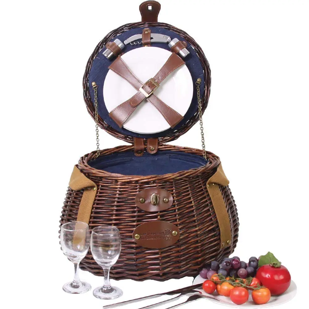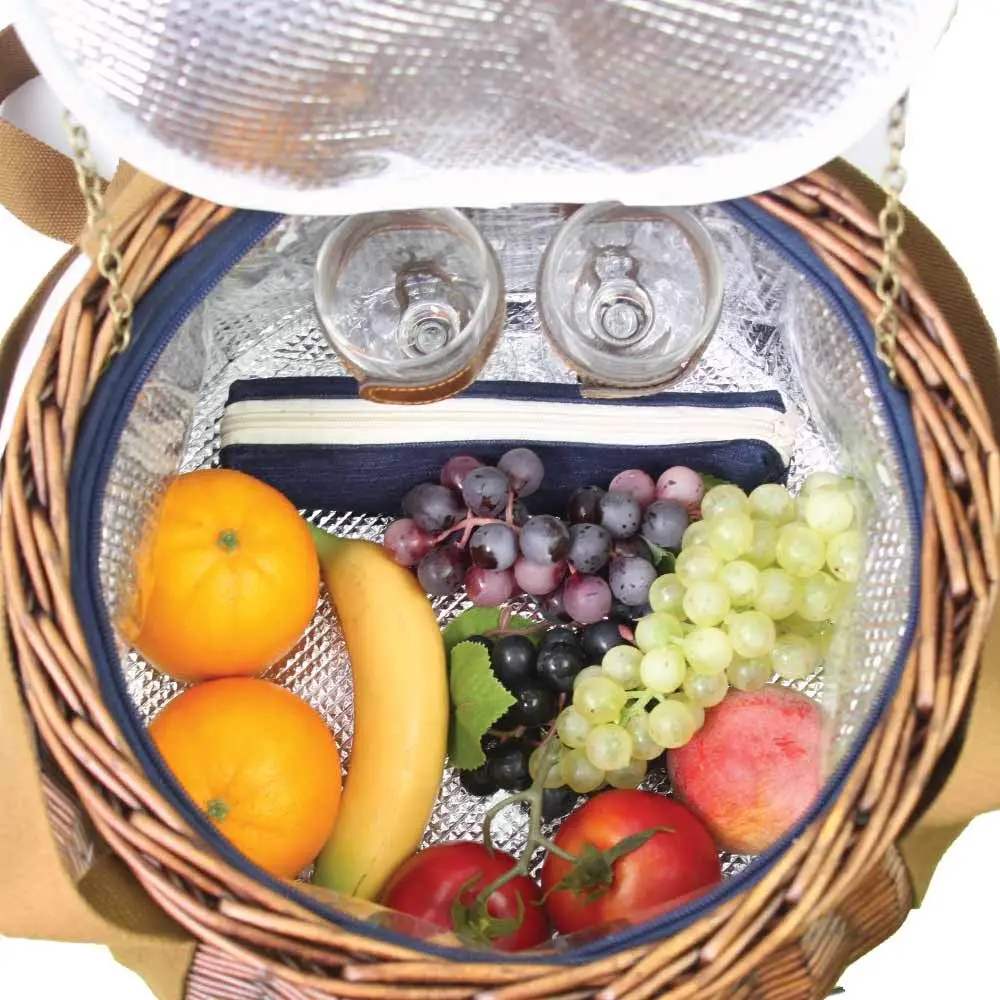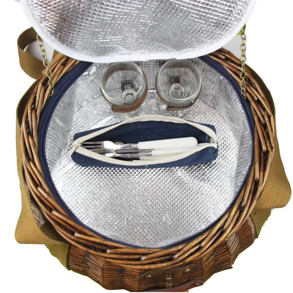 Kosz piknikowy z wyposażeniem dla dwóch osób. Wykonany ręcznie z estetycznej wikliny. Kosz został wyłożony materiałem termoizolacyjnym. Jest lekki i łatwy w przenoszeniu. Modny i szykowny kosz to idealny wiosenny lub letni prezent dla par.