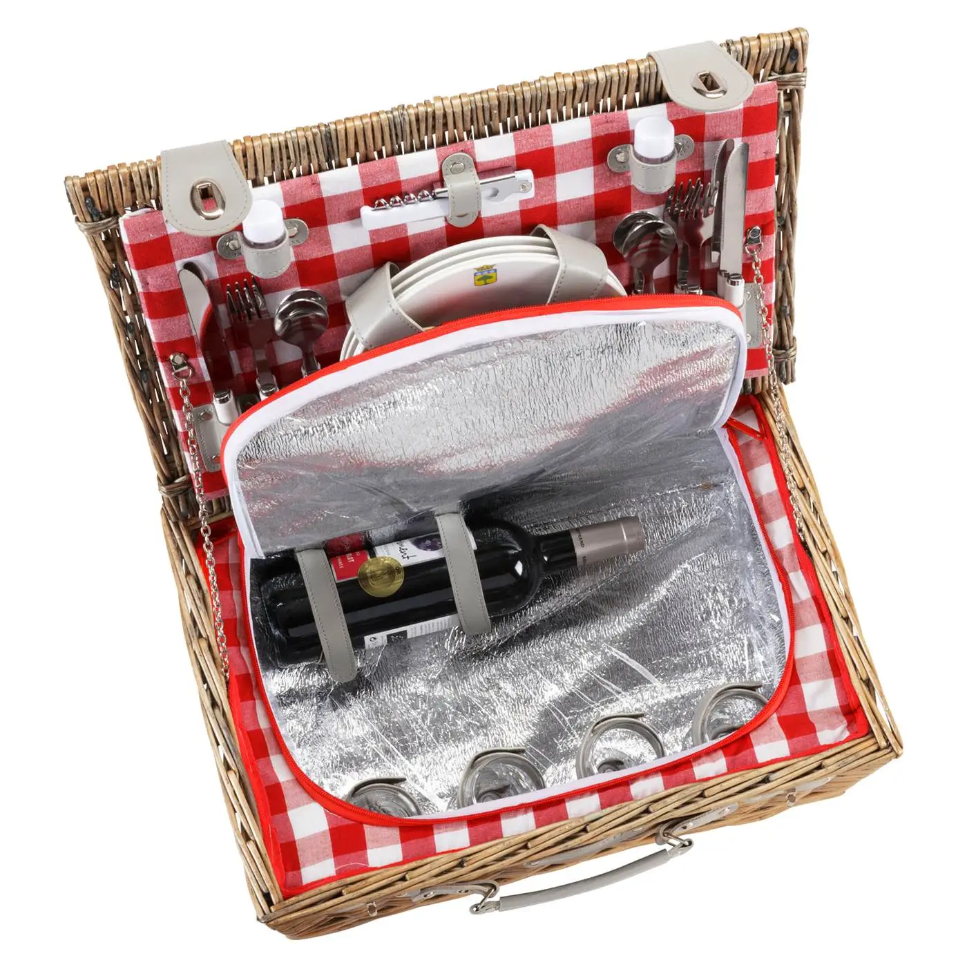 Kosz jest także bardzo praktyczny. Posiada on dużą izolowaną komorę z dwoma zakładkami do trzymania butelki, co pozwoli na bezpieczne zabranie ze są np napoju lub ulubionego wina. Pozwoli to również na utrzymanie go i żywności w pożądanej temperaturze na dłużej. Kosz ten został wyposażony we wszystkie niezbędne akcesoria - 4 talerze ceramiczne o średnicy 20 cm i kremowym kolorze, 4 szklane kieliszki do wina oraz 4 komplety sztućców wykonanych ze stali nierdzewnej z białymi, melaminowymi rączkami. Ponadto posiada on przydatne akcesoria dodatkowe takie jak korkociąg z otwieraczem do butelek oraz solniczkę i pieprzniczkę. Kosz ten wyposażony został także w małą torbę do przechowywania brudnych naczyń, dzięki czemu z łatwością można je będzie oddzielić od pozostałych. Wszystkie naczynia oraz akcesoria myć można w zmywarce, co ułatwi i przyśpieszy ich czyszczenie.
