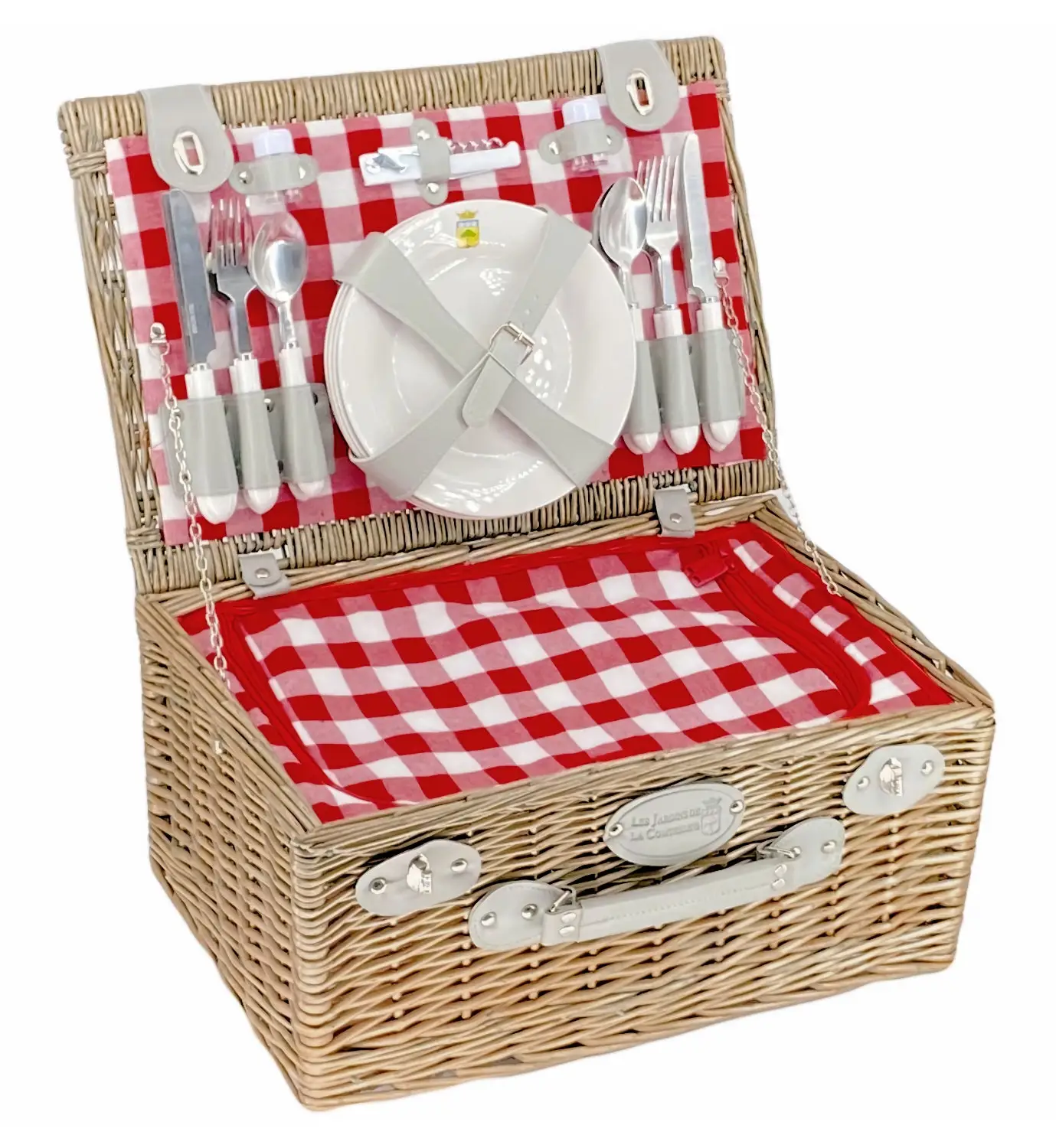 Wykonany ręcznie z naturalnej, patynowanej wikliny kosz piknikowy Marly przeznaczony jest maksymalnie dla 4 osób. Doskonale sprawdzi się na piknik w parku, bądź ogrodzie z rodziną czy znajomymi w słoneczny wiosenny lub letni dzień. Materiał wykonania w połączeniu z unikalnym designem, tkaniną w czerwono-białą kratkę oraz jasnoszarymi paskami nadaje mu bardzo stylowy, wyjątkowy wygląd.