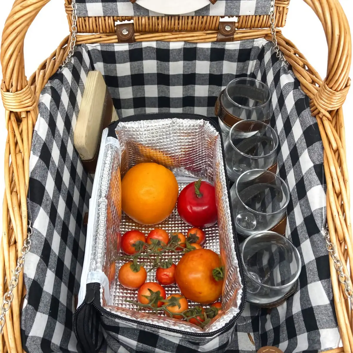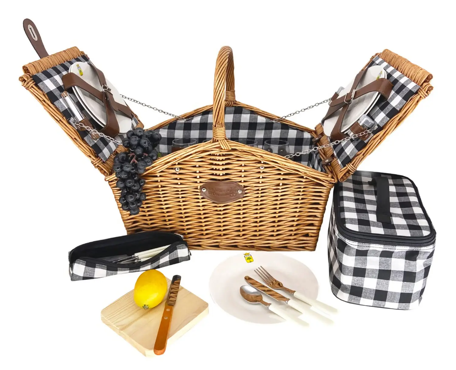 W komplecie dołączone zostały 4 talerze ceramiczne o średnicy 18 cm, etui zawierające 4 zestawy sztućców wykonane z białej melaminy na które składają się łyżki, widelce i noże. Do tego w wyposażeniu znajdują się także 4 szklane kieliszki do wina, deskę do krojenia, korkociąg oraz przyprawniki (pieprzniczka i solniczka). Dołączona została również torba poliestrowa przeznaczona do przechowywania brudnych naczyń po pikniku, tak by nie zabrudziły wnętrza kosza. W komplecie znajduje się ponadto wyjmowana izolowana kieszeń, w które można przechowywać jedzenie w chłodzie podczas całej jazdy. Sam kosz jest dość lekki, dzięki czemu łatwo się go przenosi. Ułatwia to także centralnie umieszczony uchwyt. Wszystkie naczynia i akcesoria mają w nim odpowiednie miejsca i zabezpieczane są paskami. Ich zaletą jest ponadto łatwość w czyszczeniu - nadają się do mycia w zmywarce.