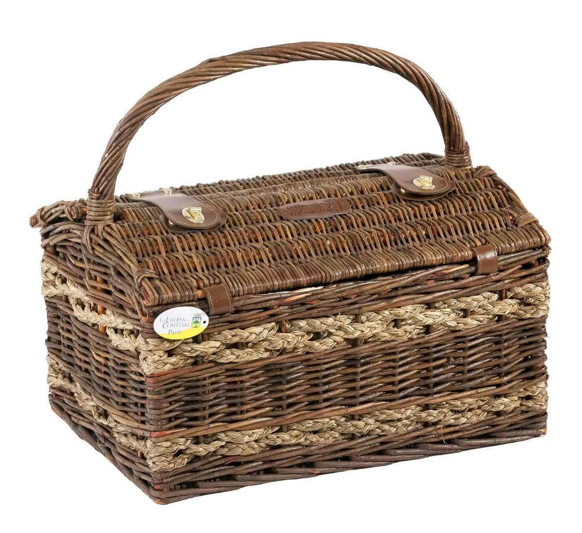 Tradycyjnie wyglądający kosz piknikowy Montmartre dla 4 osób wykonany został z naturalnej wikliny i sznurków z rafii. Wewnątrz wyłożono go tkaniną w beżowe, brązowe, bordowe, czarne i zielone paski, która nadaje mu unikalnego wyglądu. Kosz świetnie nada się na rodzinny piknik podczas słonecznych wiosennych i letnich dni, elegancko prezentując się na plaży, w parku czy ogrodzie.