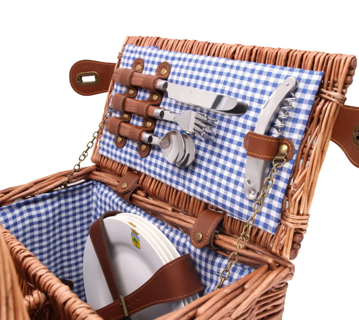 W komplecie znajdują się odpowiednio zabezpieczone 4 porcelanowe talerze o śr. 20,5 cm, 4 szklane kieliszki do wina o poj. 140 ml, 4 zestawy sztućców z uchwytami z drewnopodobnej melaniny (łyżki deserowe, noże, widelce) oraz 4 bawełniane serwetki w pasującą kolorystycznie do kosza niebiesko-białą kartkę, wykonane ze stali nierdzewnej przyprawniki (solniczka i pieprzniczka) i korkociąg. Dodatkową zaletą dołączonych akcesoriów i naczyń jest możliwość mycia w zmywarce, co ułatwi ich czyszczenie. W wyposażeniu jest także poliestrowa, wodoodporna torba do przechowania brudnych naczyń po pikniku. Wewnątrz kosz podzielono na trzy części, z czego jedna stanowi izolowaną komorę, dzięki czemu zabrana żywność zachowa na dłużej swoją temperaturę, w drugiej można umieścić do 3 butelek z winem lub napojem, a w trzeciej umieszczono część wyposażenia. Dzięki temu łatwo zachować w nim porządek. Szeroki, mocny uchwyt pozwala na wygodniejszy transport na wybrane miejsce.