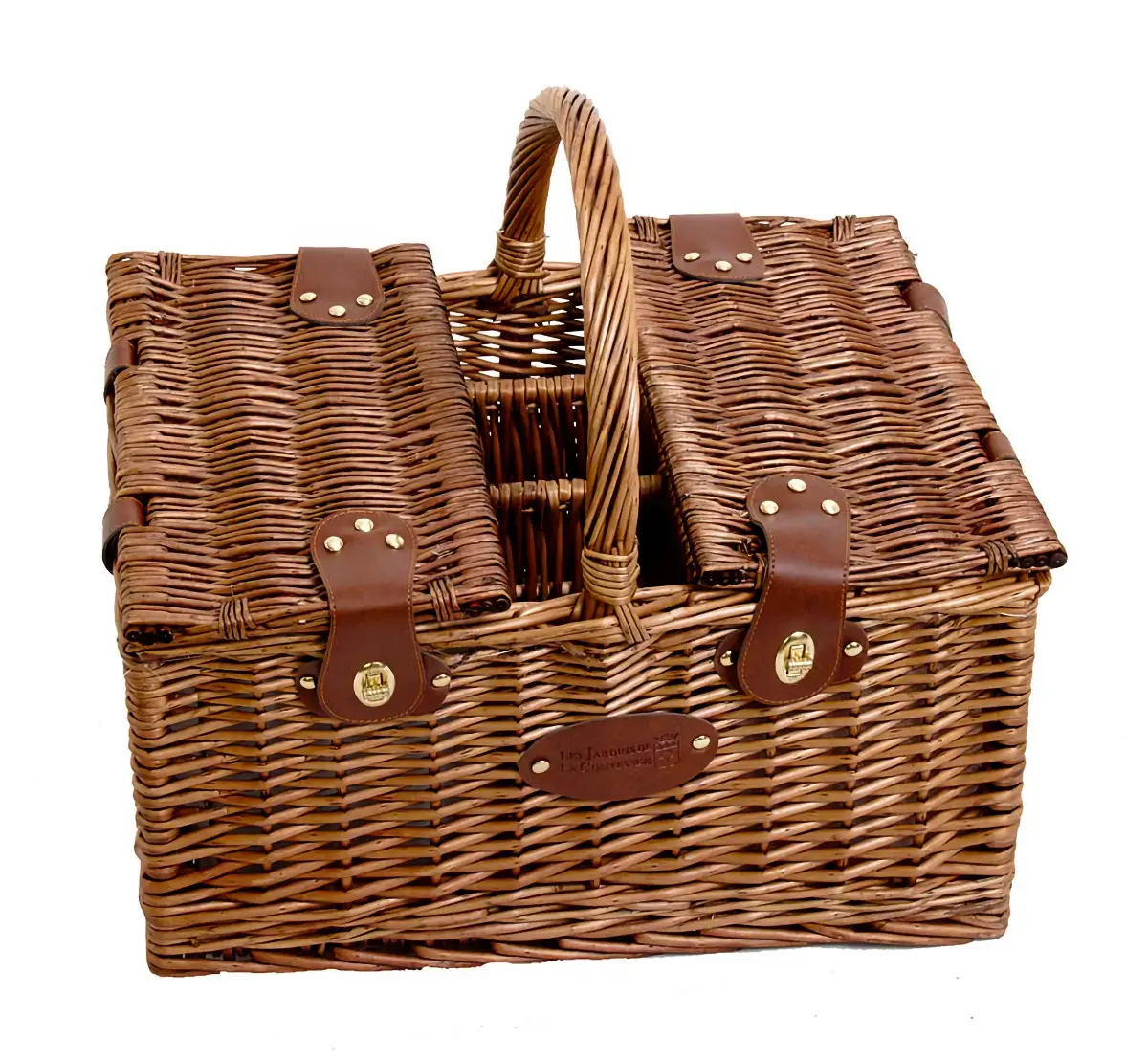 Tradycyjny kosz piknikowy dla 4 osób Saint-Germain dostępny jest w kilku kolorach, co pozwala na dobranie odcienia pod własne preferencje. Naturalny odcień wikliny, brązowe paski i tkanina w kratkę nadają mu rustykalny, choć pełen elegancji wygląd. Kosz doskonale sprawdzi się w wiosenny lub letni dzień podczas wspólnego czasu z rodziną lub znajomymi, dzięki dołączonemu wyposażeniu umożliwiając wygodne zabranie i spożycie posiłków na łonie natury.