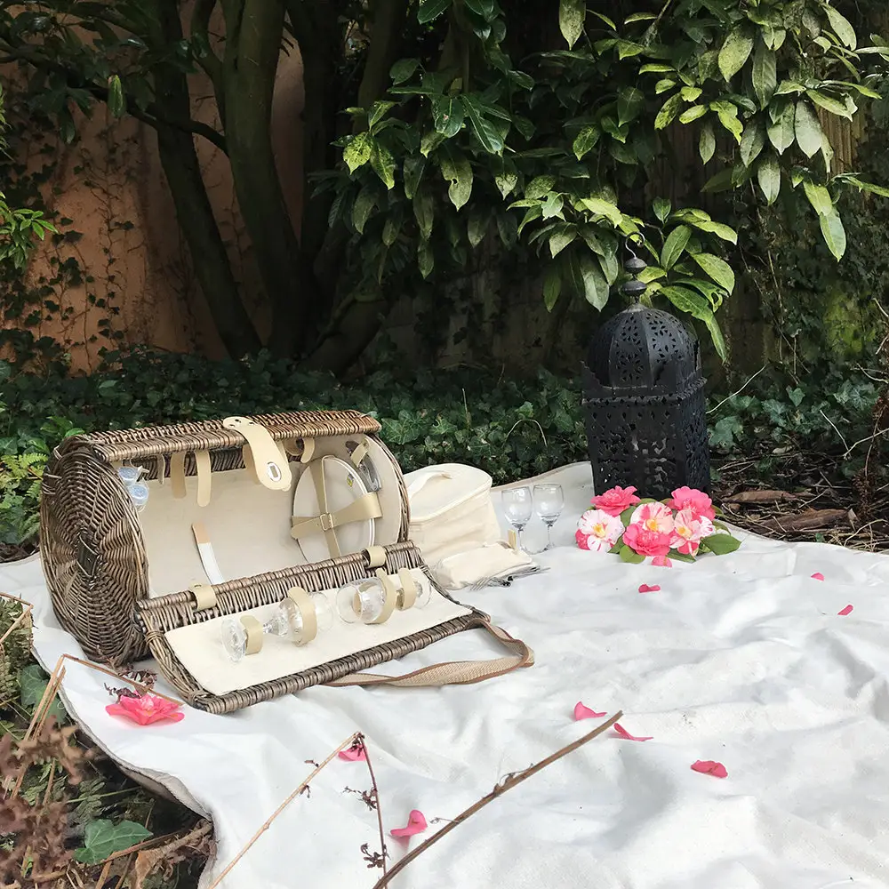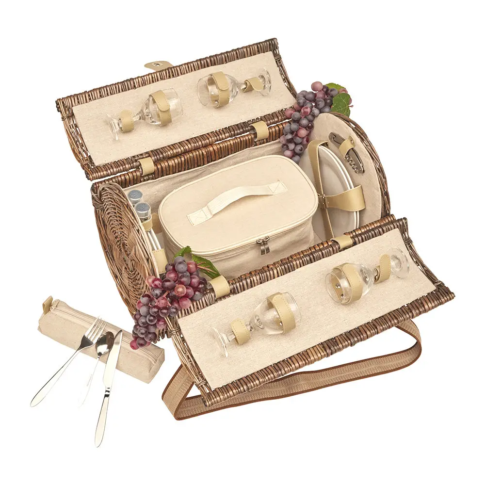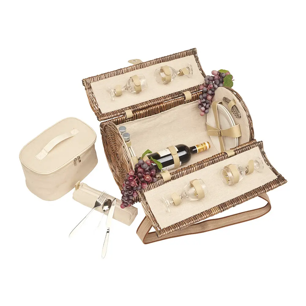 Kosz piknikowy z wyposażeniem dla czterech osób. Wykonany ręcznie z estetycznej wikliny. Modny i szykowny kosz to idealny wiosenny lub letni prezent. Wyposażony jest w wyjmowaną izolowaną torbę termiczną.