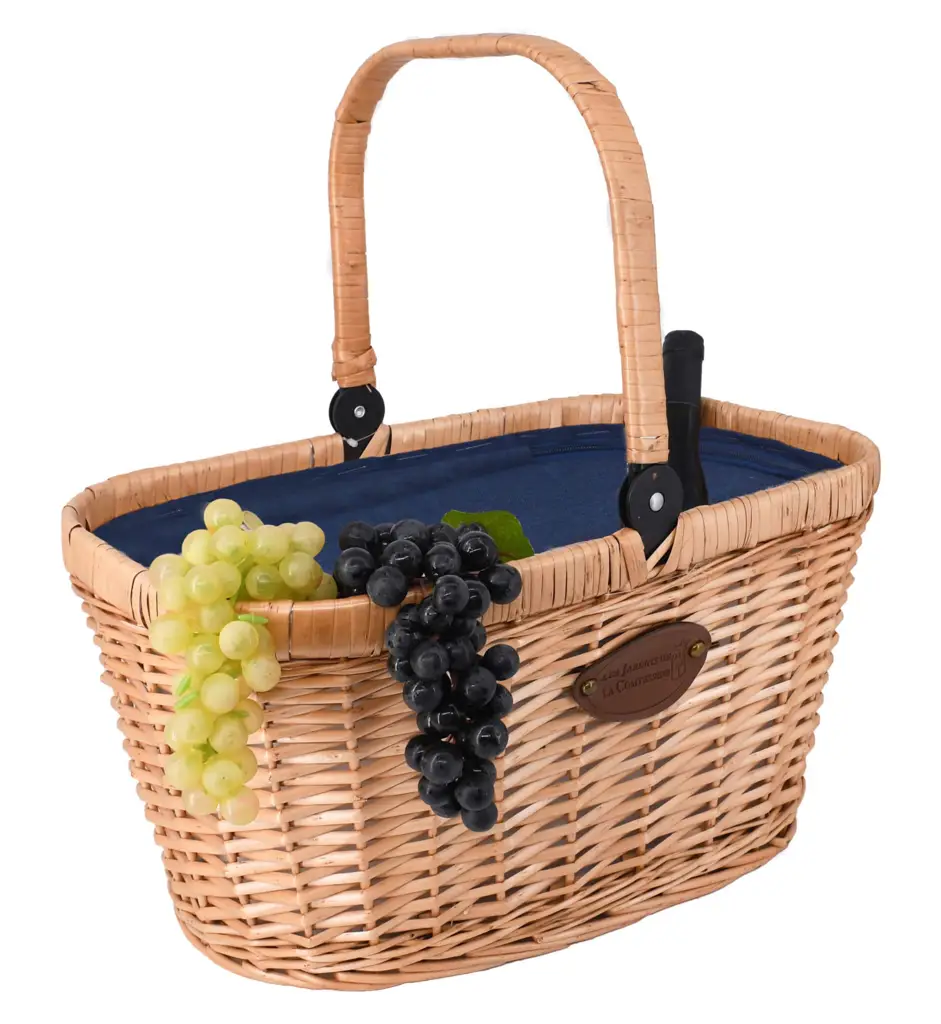 Prezentowany kosz piknikowy Chantilly Blue Denim o wymiarach 48 x 29 x 50 cm (26 cm po opuszczeniu rączki) zmieści w sobie napoje i żywność na piknik, a także posłuży jako ekologiczna “torba” na zakupy, pozwalając na wygodne przetransportowanie zakupionych warzyw, owoców i innych produktów. Wykonano go ręcznie z wikliny o naturalnej beżowo-brązowej barwie oraz bawełnianej tkaniny w granatowym kolorze z efektem denimu, dzięki czemu wyróżnia się on wysoką jakością i eleganckim, nowoczesnym wyglądem. Jego niewątpliwą zaletą jest zapinana na zamek błyskawiczny komora izotermiczna, która zapewnia prywatność oraz zachowuje umieszczone wewnątrz napoje, posiłki i produkty w chłodzie. Dodatkowo możliwość złożenia uchwytu, sprawia że kosz jest wyjątkowo łatwy w transporcie oraz przechowywaniu.