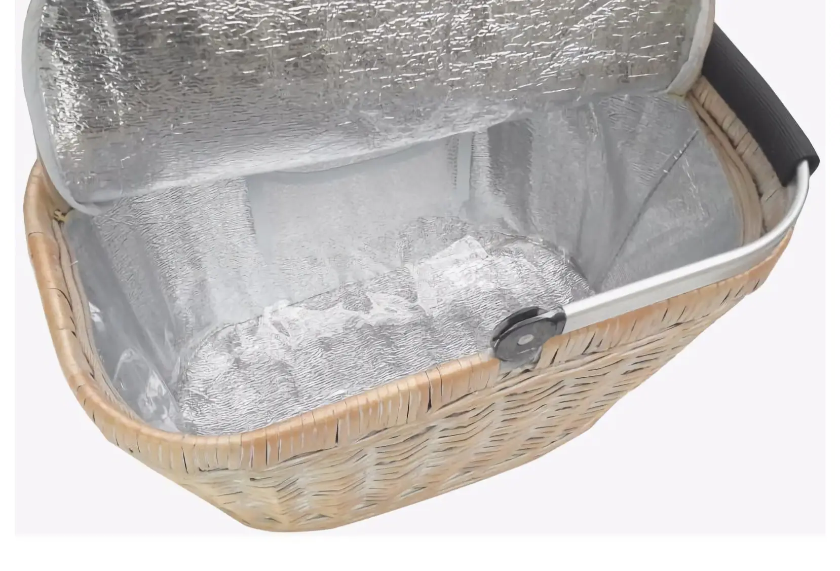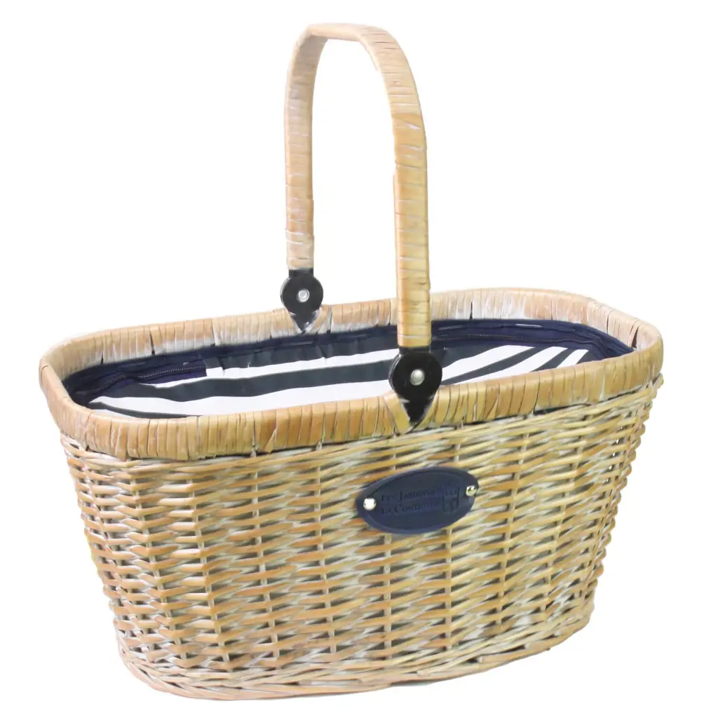 Prezentowany kosz piknikowy Chantilly Marine o wymiarach 48cm x 28cm x 50 cm (26 cm po opuszczeniu rączki) zmieści w sobie napoje i żywność na piknik, a także posłuży jako ekologiczna “torba” na zakupy, pozwalając na wygodne przetransportowanie zakupionych produktów. Wykonany został ręcznie z pobielanej wikliny oraz bawełnianej tkaniny w pasy, co zapewnia unikalność i wysoką jakość, a także estetyczną prezentację wizualną. Jego uchwyt można składać, dzięki czemu kosz jest niezwykle praktyczny i łatwy w transporcie oraz przechowywaniu. Dodatkową zaletą produktu jest fakt, że jego wnętrze stanowi izotermiczną komorę, która utrzyma napoje i żywność w chłodzie, a także zapewni prywatność dzięki zapięciu na zamek błyskawiczny. Wewnątrz znajduje się także osobna kieszeń, ułatwiająca przechowywanie drobnych akcesoriów takich jak chusteczki higieniczne, klucze czy portfel.