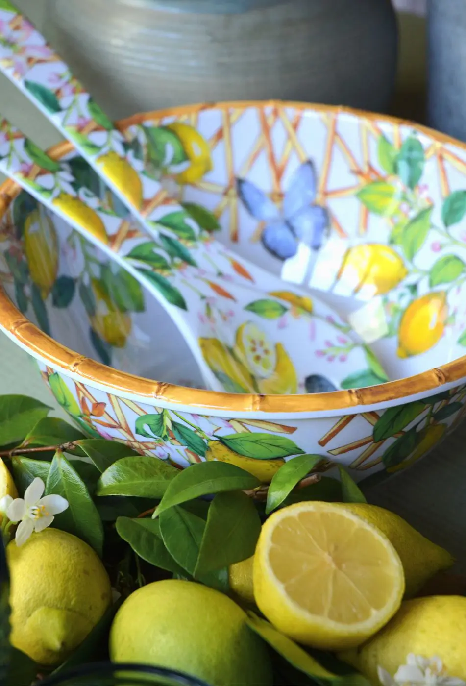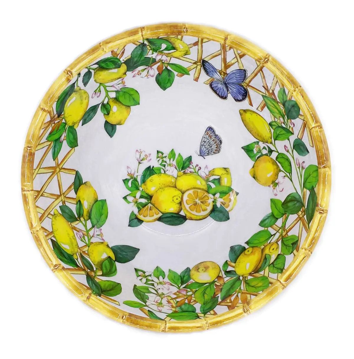 Prezentowana duża salaterka o średnicy 25 cm, wysokości 11 cm i pojemności 3 L wyjątkowo zaprezentuje się na stole podczas posiłków spożywanych zarówno wewnątrz jak i na zewnątrz dzięki wzorowi motyli i gałązek drzewek cytrynowych oraz wykończeniu z efektem bambusa. Świetnie wyeksponuje przeróżne sałatki podkreślając ich kolory. Miska stanowić będzie atrakcyjne uzupełnienie posiadanej zastawy, bądź reszty naczyń z tej samej kolekcji. Nie została ona przystosowana do używania w kuchence mikrofalowej i piekarniku. By jak najdłużej zachować jej żywe kolory należy ją myć ręcznie lub w zmywarce w trybie ekologicznym (maksymalnie 50°). Aby nie porysować miski zaleca się nieużywanie sztućców o ostrych krawędziach.