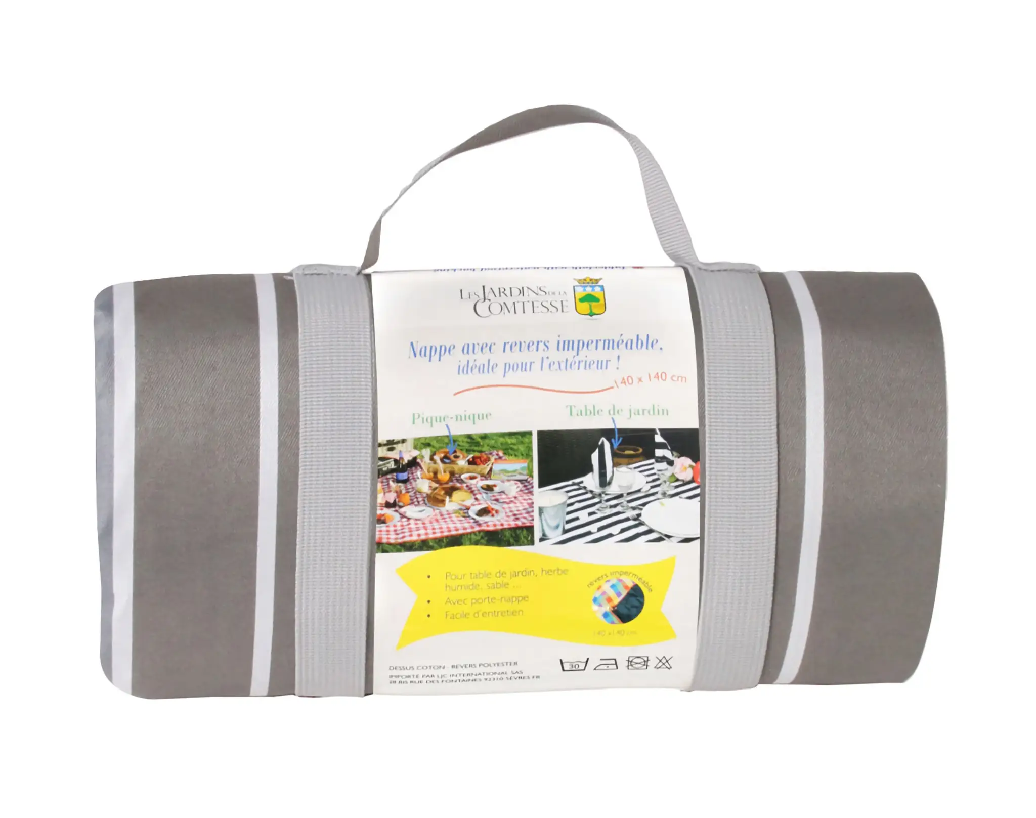 Oferowany przez Les Jardins de la Comtesse koc Versailles ma kwadratowy kształt o wymiarach 140 x 140 cm i doskonale nada się na wypady w niewielkim dwu- do cztero- osobowym gronie. Jego górna strona wykonana została z przyjemnej w dotyku bawełny w neutralnej, szaro-beżowej kolorystyce ze wzorem z pasy, a spodnia z poliestru, który charakteryzuje się wodoodpornością, dzięki czemu nie trzeba będzie się przejmować gdy ziemia w wybranej lokalizacji okaże się mokra. Obrus nada się także do umieszczenia na stole ogrodowym. Produkt jest również praktyczny - można go bardzo łatwo przenosić oraz wygodnie przechowywać dzięki dołączonemu w komplecie uchwytowi i niewielkiej wadze. By utrzymać go w czystości można go prać w pralce w 30 stopniach Celsjusza. Koc doskonale uzupełni się z koszami piknikowymi Les Jardins de la Comtesse o podobnej kolorystyce czy wzorze.