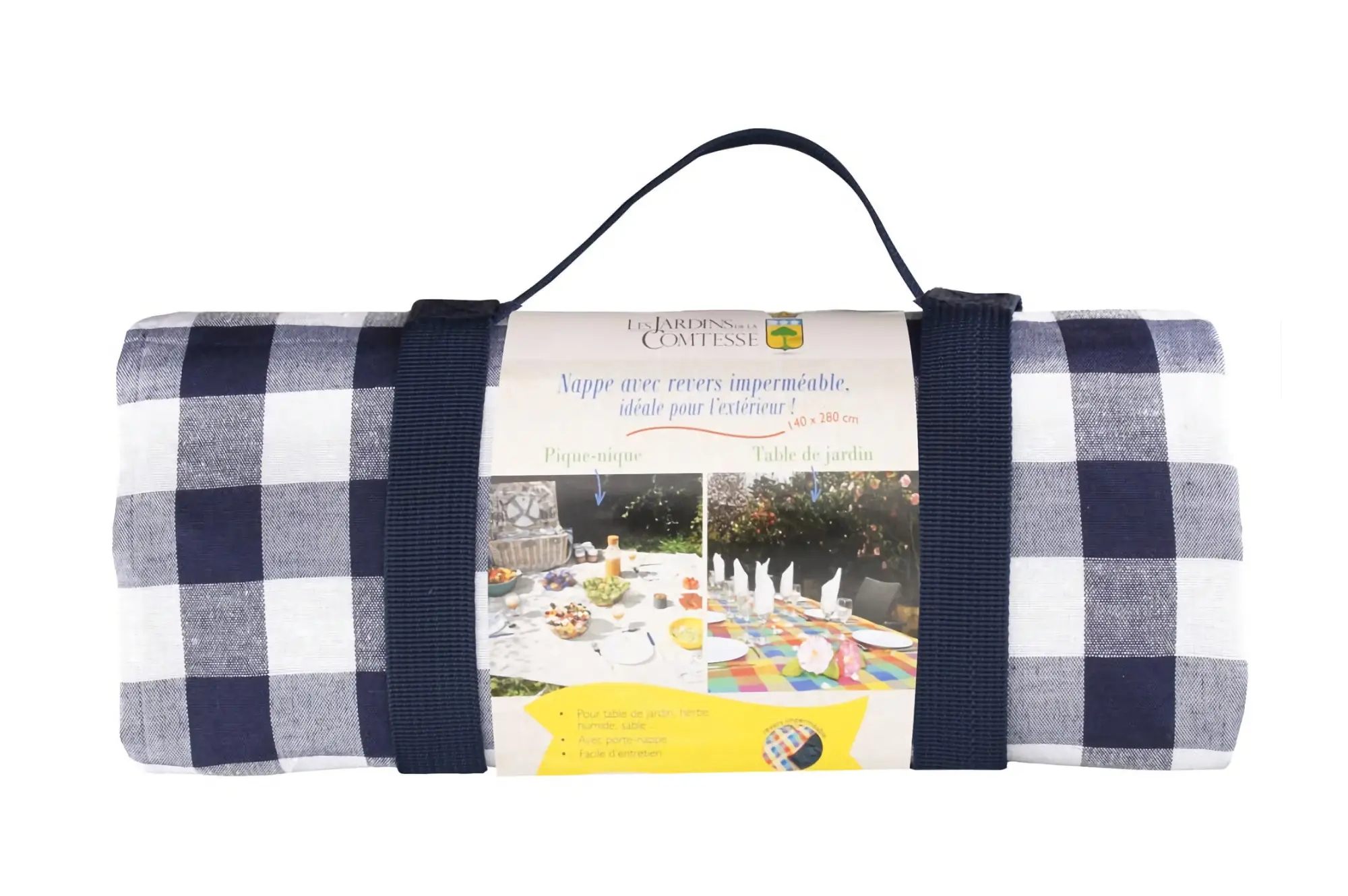 Oferowany przez Les Jardins de la Comtesse prostokątny koc Blue & White Checkered o wymiarach 280 x 140 cm świetnie nada się na wypady w większym gronie osób. Spód obrusu wykonano z poliestru o właściwościach wodoodpornych, dzięki czemu nie trzeba będzie się przejmować gdy ziemia w wybranej lokalizacji okaże się mokra. Natomiast wierzchnia strona zrobiona jest z grubej bawełny w granatowej kolorystyce ze wzorem w kratę. Dołączony w komplecie uchwyt umożliwia zwinięcie i zapięcie obrusu, pozwalając na łatwe przenoszenie oraz przechowywanie. Produkt jest także łatwy w utrzymaniu w czystości - można go prać w pralce w 30 stopniach Celsjusza. Doskonale uzupełni się on z koszami piknikowymi Les Jardins de la Comtesse o podobnej kolorystyce czy wzorze. Można go będzie także użyć na stole ogrodowym o długości 220 - 260 cm.