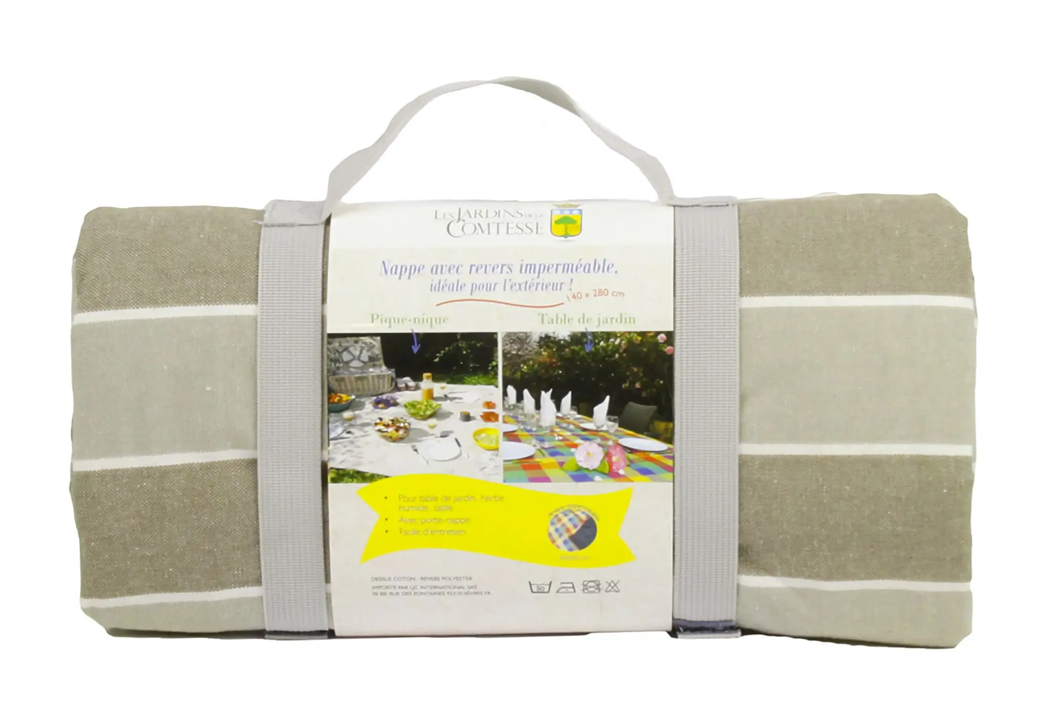 Oferowany przez Les Jardins de la Comtesse prostokątny koc Polo Club o wymiarach 280 x 140 cm świetnie nada się na wypady w większym gronie osób. Spód obrusu wykonano z poliestru o właściwościach wodoodpornych, dzięki czemu nie trzeba będzie się przejmować gdy ziemia w wybranej lokalizacji okaże się mokra. Natomiast wierzchnia strona zrobiona jest z grubej bawełny w beżowej kolorystyce ze wzorem w pasy. Dołączony w komplecie uchwyt umożliwia zwinięcie i zapięcie obrusu, pozwalając na łatwe przenoszenie oraz przechowywanie. Produkt jest także łatwy w utrzymaniu w czystości - można go prać w pralce w 30 stopniach Celsjusza. Doskonale uzupełni się on z koszami piknikowymi Les Jardins de la Comtesse o podobnej kolorystyce czy wzorze. Można go będzie także użyć na stole ogrodowym o długości 220 - 260 cm.