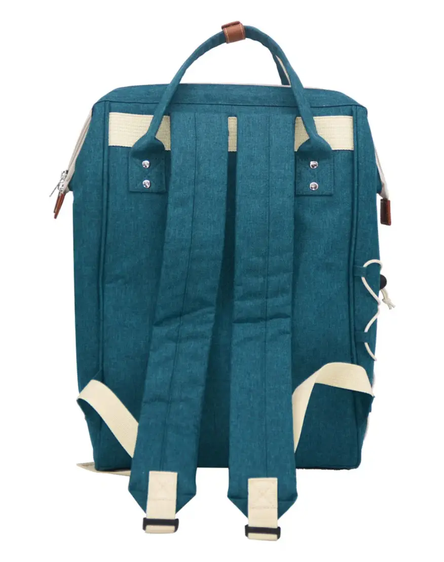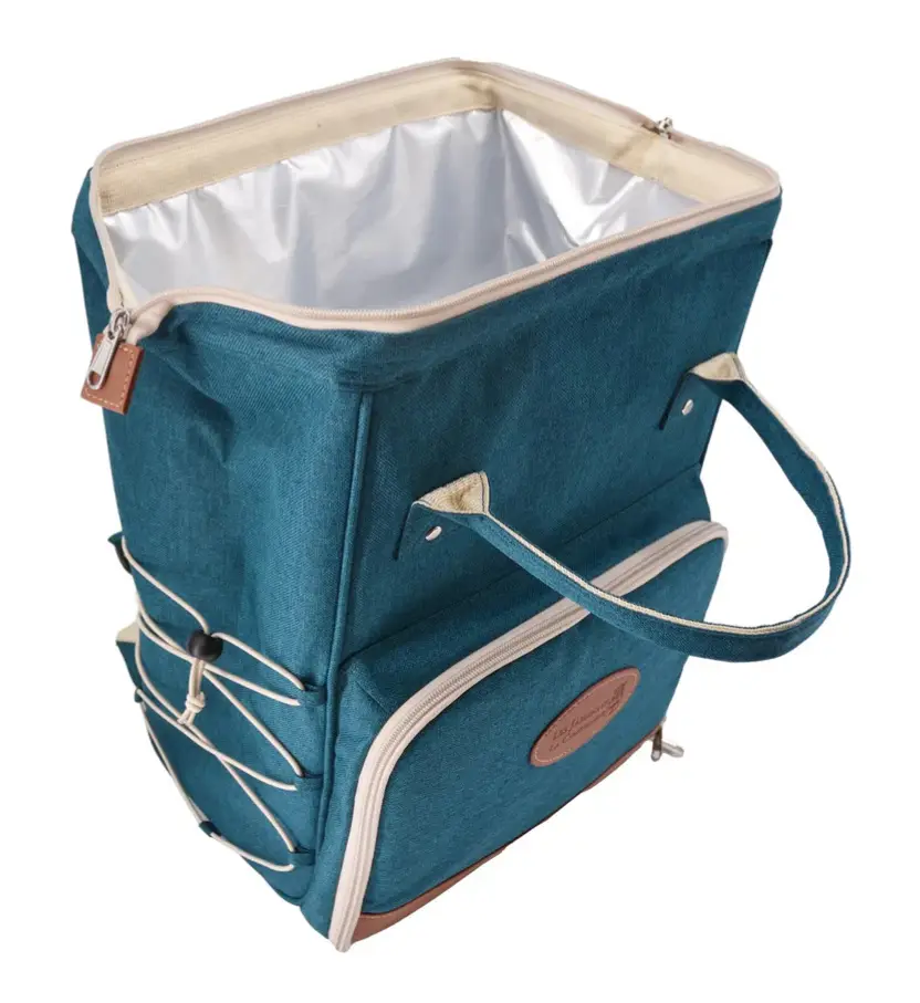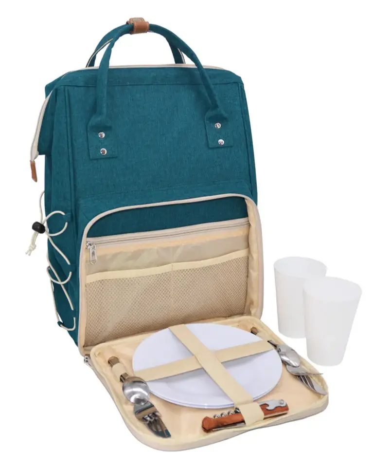 Prezentowany plecak dla 2 osób w kolorze duck blue posiada dużą, zapinaną na zamek komorę izotermiczną, która zastąpi lodówkę, umożliwiając przeniesienie żywności z zachowaniem jej temperatury. Posiada także z przodu kilka małych kieszonek do przechowywania kluczy lub telefonu. Dodatkowo z boku znajduje się regulowana gumka umożliwiająca przymocowanie obrusu (do kupienia osobno) lub przechowywanie lekkiej kurtki. Komfort noszenia gwarantują natomiast regulowane szelki. W komplecie dołączono do niego 2 talerze, 2 szklanki z polipropylenu, sommelier i zestaw sztućców ze stali nierdzewnej.
