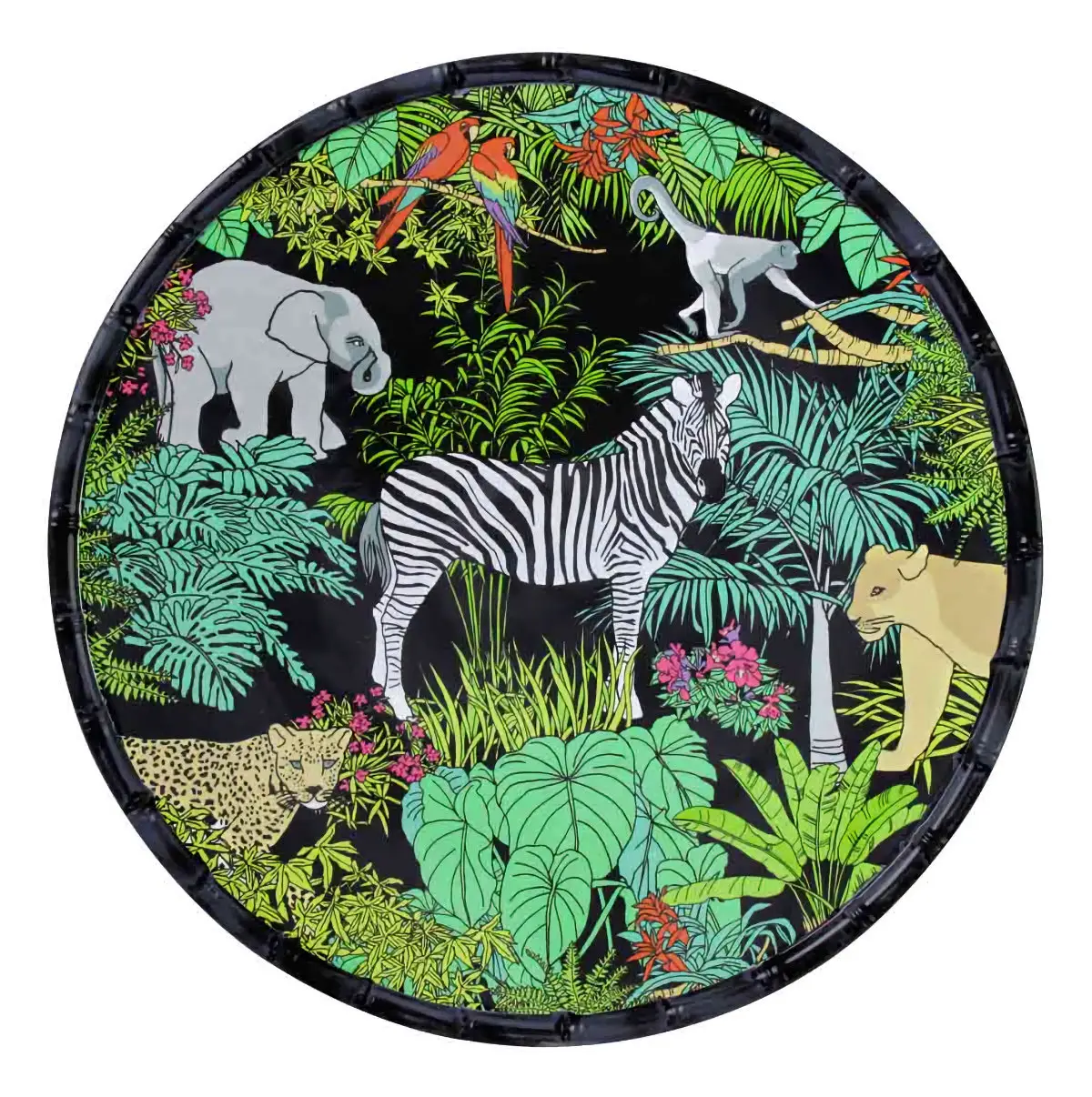 Prezentowany duży talerz o średnicy 35,5 cm ozdobiony został roślinami i różnymi gatunkami zwierząt, w tym zebrą, dzikimi kotami i słoniem, dzięki czemu niepowtarzalnie zaprezentuje się na stole podczas posiłków spożywanych zarówno wewnątrz jak i na zewnątrz. Z łatwością można go uzupełnić innymi naczyniami z kolekcji lub o podobnej tematyce, tworząc unikalną, tropikalną kompozycję lub użyć jako dodatek uatrakcyjniający zastawę. Talerz nie nadaje się do używania w kuchence mikrofalowej i w piekarniku. By zachować jego żywe kolory należy go myć ręcznie bądź w zmywarce w trybie ekologicznym (maksymalnie 50°). Aby uchronić go przed zarysowaniami zaleca się nieużywanie noży o zbyt ostrych zębach takich jak np. noże do steków.