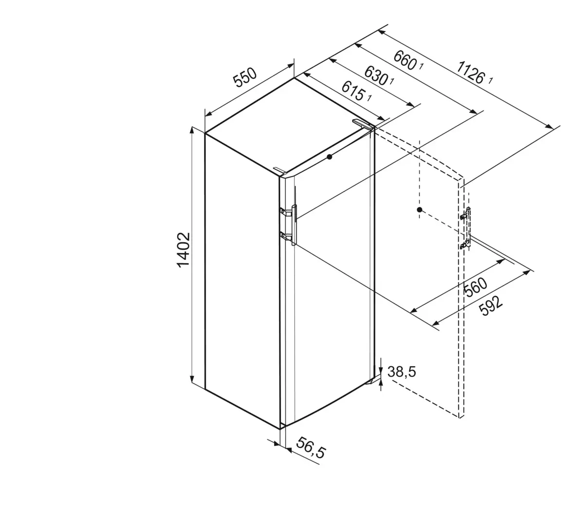 - Wymiary zewnętrzne: wysokość / szerokość / głębokość: 140,2 / 55 / 63 cm