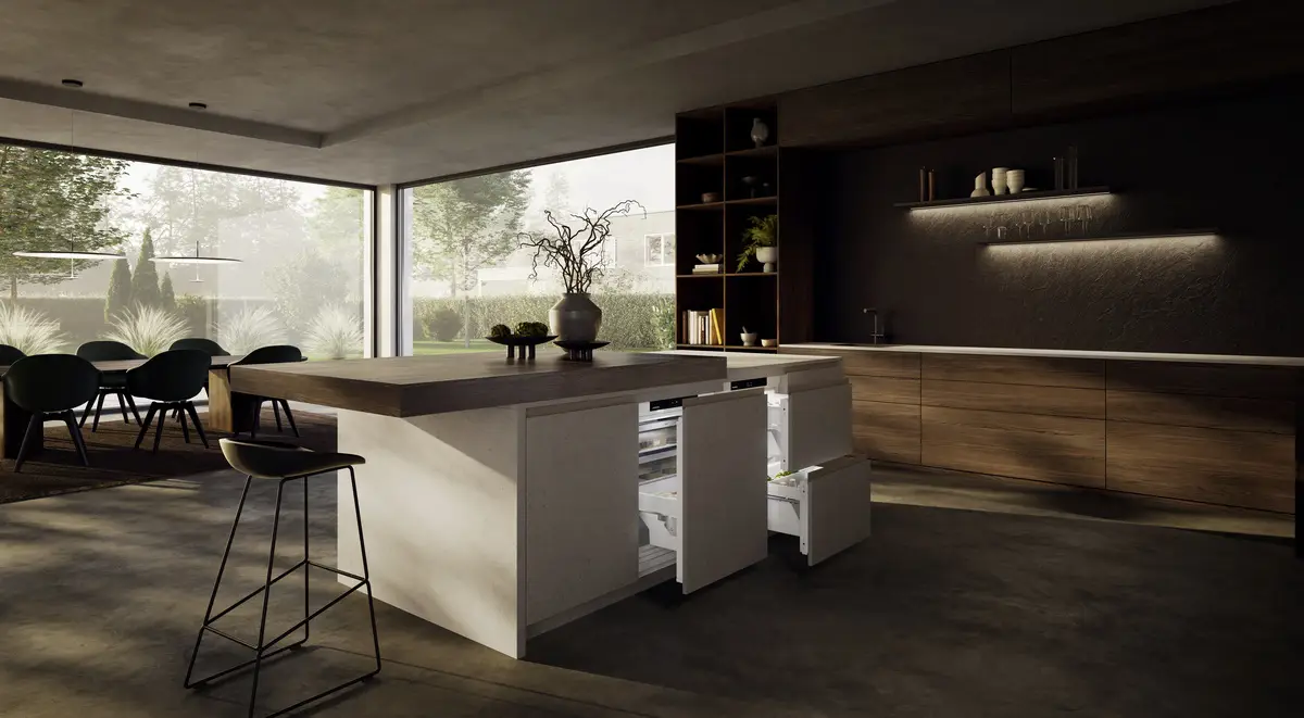 Wnętrze komory zostało zaprojektowane z naciskiem na wygodę i przejrzystość. Szuflady FrostSafe są zamknięte ze wszystkich stron i mają przezroczyste fronty, a ich teleskopowe prowadnice z samoczynnym domykaniem zapewniają wyjątkowo komfortowy dostęp do żywności. Dodatkowo oświetlenie górne LED ułatwia szybkie odnalezienie produktów.
