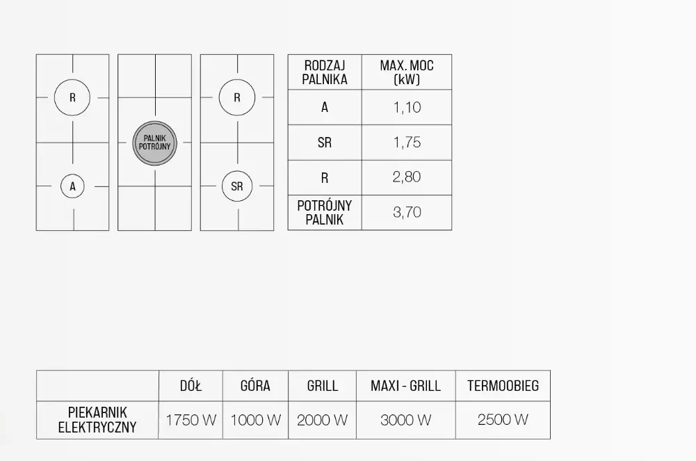 | Typ grzewczy: | Gazowa (płyta grzewcza) Elektryczny (piekarnik) |