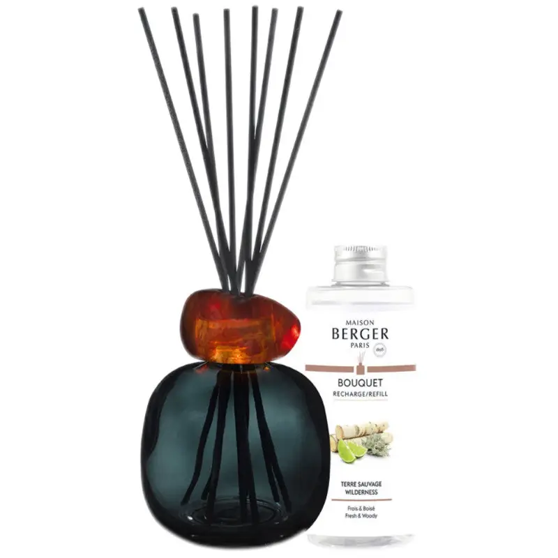 Maison Berger Paris prezentuje wyrazisty zestaw patyczków zapachowych Minerały w wersji czarno-bursztynowej, w którym nowoczesny design łączy się z przygodową duszą kompozycji Dziki Ląd. Stylowy flakon inspirowany strukturą minerałów i ziemistymi kolorami stanowi oryginalną dekorację wnętrza, dodając mu charakteru i elegancji.