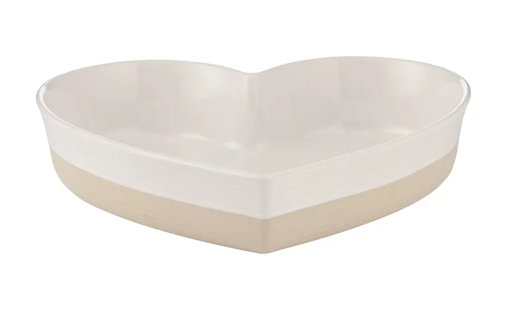 Prezentowana forma do pieczenia o pojemności 1,5 L i wymiarach 28 x 25 x 6 cm wykonana została z kamionki i ma kształt serca. Doskonale nada się do przygotowywania i podawania różnych ciast i zapiekanek. Jej zewnętrzne ścianki są żebrowane, co w połączeniu z beżowo-kremowym kolorem sprawia, że estetycznie wygląda. Forma nadaje się do piekarnika (240°C), mikrofalówki oraz zamrażalnika. Dodatkowo można ją myć w zmywarce.