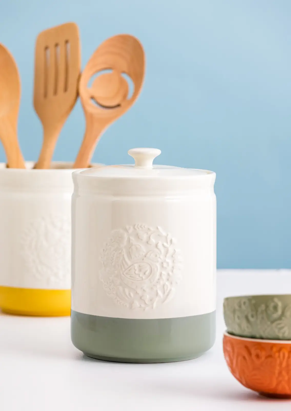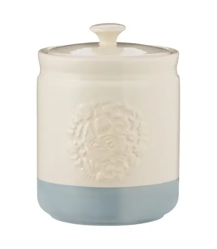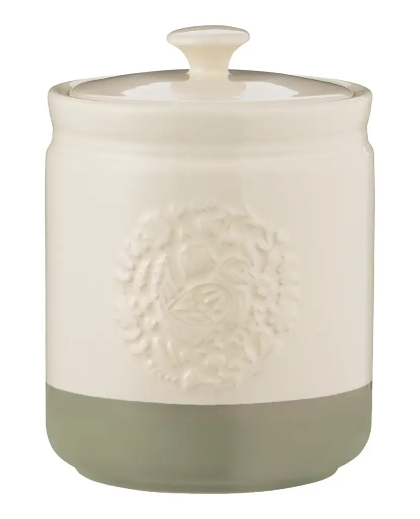 Prezentowany pojemnik ma pojemność 1,5 L i wymiary 13 x 19 cm (śr. x wys.). Wykonano go z kamionki, która nie absorbuje zapachów i nie wpływa na smak. Pojemnik doskonale nada się do przechowywania produktów sypkich, dzięki szczelnej pokrywie zachowując ich świeżość na dłużej, jednocześnie chroniąc ją przed wilgocią i zabrudzeniami. Dodatkowo tłoczony dekor z przodu i kremowo-zielony kolor sprawia, że estetycznie wyglądać będzie na blacie lub w szafce. Pojemnik nadaje się wyłącznie do mycia ręcznego.