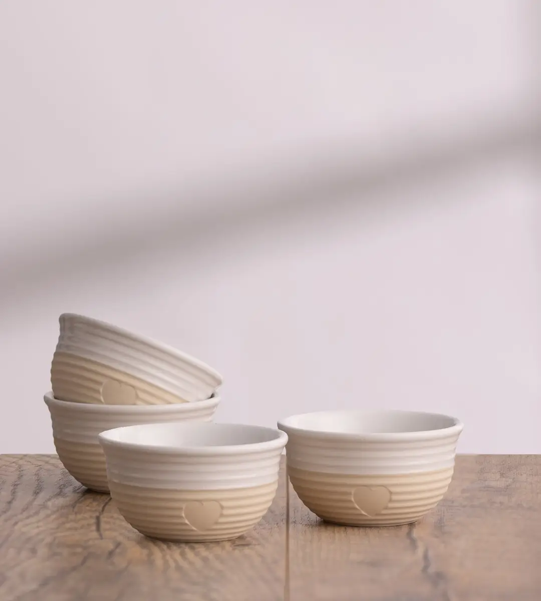 Prezentowany zestaw 4 miseczek o pojemności 150 ml i wymiarach 9,5 x 5 cm (śr. x wys.) wykonany został z kamionki, która nie wpływa na smak i nie przejmuje zapachów. Idealnie nadadzą się do podawania przekąsek, kawałków owoców itp. Ich zewnętrzne ścianki są żebrowane, co w połączeniu z beżowo-kremowym kolorem sprawia, że estetycznie wyglądają. Zestaw nadaje się do mikrofalówki oraz zamrażarki. Dodatkowo można go myć w zmywarce.