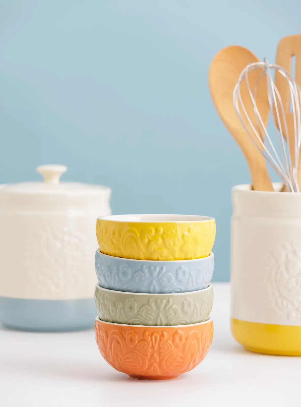 Prezentowany zestaw 4 miseczek o pojemności 200 ml i wymiarach 10 x 5 cm (śr. x wys.) wykonany został z kamionki, która nie wpływa na smak i nie przejmuje zapachów. Idealnie nadadzą się do podawania przekąsek, kawałków owoców itp. Ich zewnętrzne ścianki są pokryte różnymi kolorami i wzorami, co sprawia, że estetycznie wyglądają i łatwo je od siebie odróżnić. Zestaw nadaje się do używania w mikrofalówce. Dodatkowo można go myć w zmywarce.
