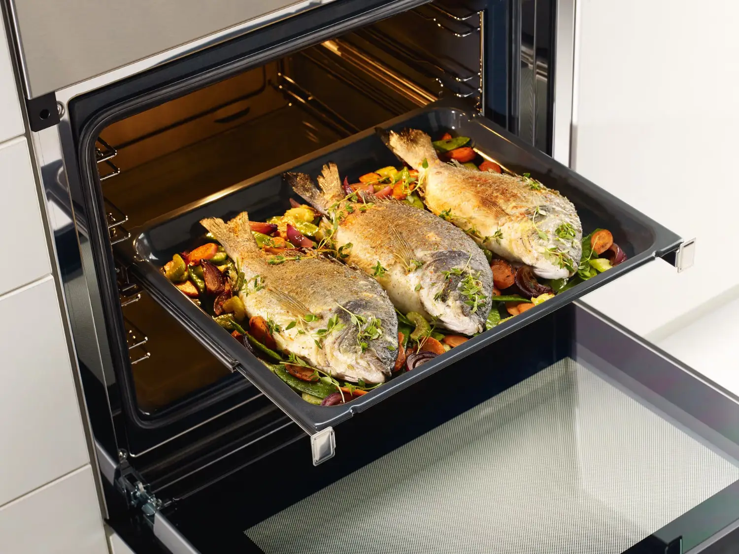 Opatentowana powłoka PerfectClean z wyjątkowym efektem nieprzywierania sprawia, że blachy do pieczenia, ruszty do pieczenia oraz opcjonalne szuflady są szczególnie łatwe czyszczeniu - nawet mocno przywarte zabrudzenia można usunąć bez wysiłku za pomocą płynu do mycia naczyń i miękkiej gąbki.
