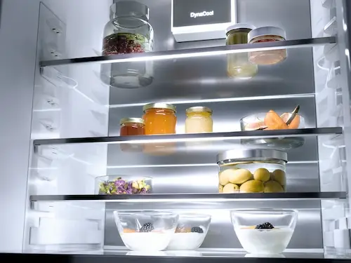 Znane z tradycyjnych chłodziarek warstwy temperatury (cieplej u góry, zimniej na dole) skutecznie eliminuje zastosowana w urządzeniu funkcja DynaCool zapewniając równomierny rozkład temperatury w całej komorze chłodzenia - wszędzie panują takie same warunki. Dzięki temu produkty można ustawiać tak w najwygodniejszy sposób, nie przejmując się poziomami. Dodatkowo optymalne warunki przechowywania w lodówce zapewnia również system świeżości PerfectFresh Active (wystarczy napełnić zbiornik wody, resztą zajmie się urządzenie Miele). Co 90 min i przy każdym otwarciu drzwi do szuflady PerfectFresh Active następuje wypuszczenie mgiełki wody, dzięki czemu produkty spożywcze są delikatnie nawilżone, a poziom wilgotności powietrza utrzymuje się na optymalnym poziomie – niezależnie od obciążenia.