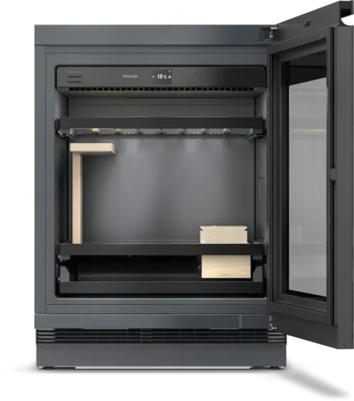 Promieniowanie UV może powodować reakcje chemiczne w winie. Drzwi szklane Miele wykonano z przyciemnianego, bezpiecznego szkła z filtrem UV, dzięki czemu wino jest skutecznie chronione przed światłem, zachowując smak i aromat.