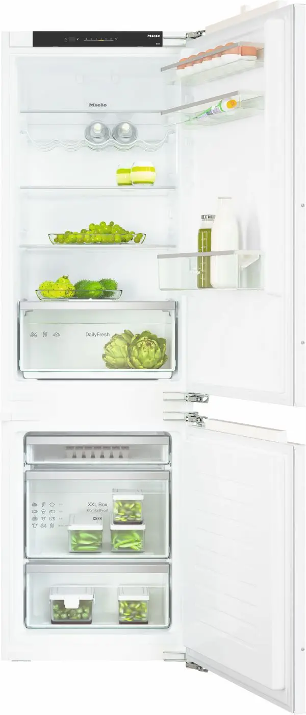 Chłodziarko-zamrażarka do zabudowy Miele KD 7724 E Active to doskonałe połączenie funkcjonalności i wydajności, które umożliwia przechowywanie żywności i mrożonek w optymalnych warunkach. Chłodziarka posiada komorę chłodzenia o pojemności 183L oraz komorę mrożenia o pojemności 84L, które zapewniają wystarczająco dużo miejsca na przechowywanie świeżych produktów i urtzymywanie ich świeżości na dłużej. Ponadto, funkcja VarioRoom daje Ci elastyczność w aranżacji przestrzeni wewnątrz chłodziarki-zamrażarki. Możesz dostosować półki i szuflady w zależności od rodzaju przechowywanych produktów, zapewniając sobie najlepsze wykorzystanie dostępnego miejsca. Pojemna szuflada z regulacją wilgoci DailyFresh to idealne rozwiązanie do przechowywania świeżych owoców i warzyw. Dzięki idealnej wilgotności, produkty utrzymują świeżość, chrupkość i aromat przez dłuższy czas. Dzięki technologii ComfortFrost, odmrażanie chłodziarki-zamrażarki staje się mniej czasochłonne i uciążliwe. Jednocześnie, obsługa urządzenia jest intuicyjna i wygodna dzięki rozwiązaniu EasyControl. Możesz łatwo dostosować ustawienia temperatury i monitorować stan urządzenia, aby utrzymać kontrolę nad przechowywanymi produktami. Diodowe oświetlenie LED wewnątrz chłodziarko-zamrażarki zapewnia optymalne rozświetlenie wnętrza. Nie tylko doskonale oświetla każdy zakamarek, ale także jest energooszczędne, co przekłada się na mniejsze zużycie energii.