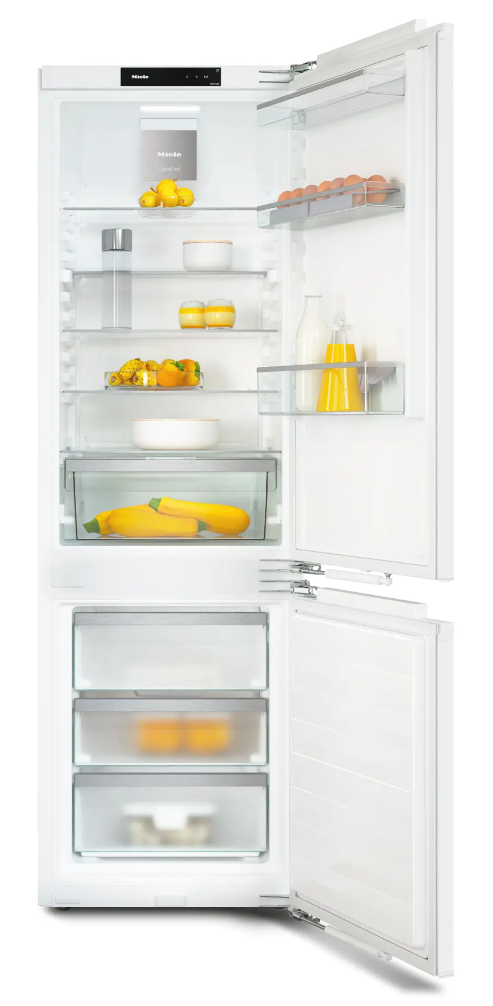 Urządzenia do zabudowy są idealnym rozwiązaniem dla tych, którzy preferują jednolite powierzchnie i minimalizm lub po prostu chcą ukryć urządzenia AGD za meblami. Oferowana przez Miele chłodziarko-zamrażarka KFN 7734 C z drzwiami z zawiasami po prawej stronie (z możliwością zmiany na lewą) idealnie spełni swoje zadanie, zapewniając komfort i praktyczność użytkowania. Całkowita pojemność 253 L (183 L komora chłodzenia + 70 L komora mrożenia) pozwoli łatwo pomieścić dużą ilość żywności i nawet nieporęczne naczynia takie jak np. blachy do pieczenia - ComfortSize. Również zastosowane w urządzeniu technologie takie jak DynaCool, DailyFresh, FlexiBoard, NoFrost czy SoftClose podnoszą komfort korzystania. Chłodziarko-zamrażarkę można podłączyć za pośrednictwem domowego routera WLAN i chmury Miele Cloud do innowacyjnego systemu Miele@home.