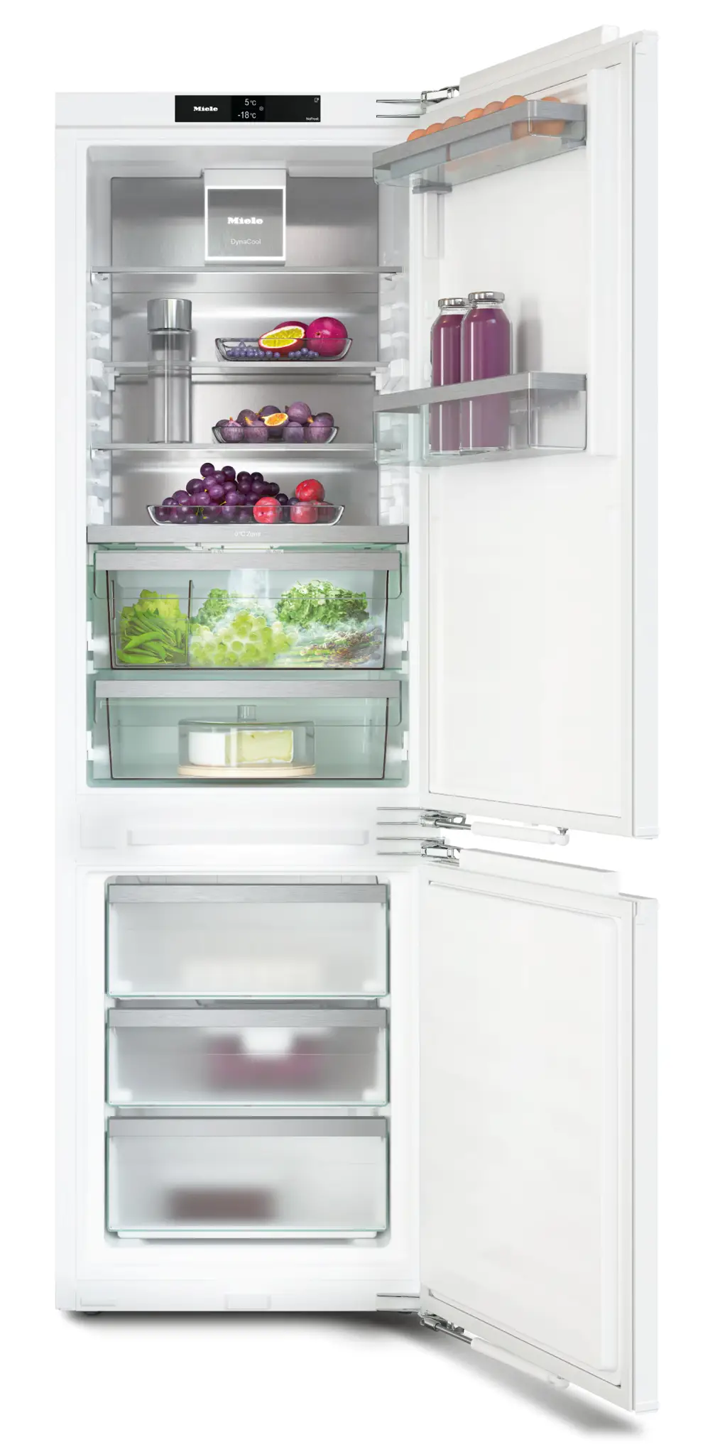 Znane z tradycyjnych chłodziarek warstwy temperatury (cieplej u góry, zimniej na dole) skutecznie eliminuje zastosowana w urządzeniu funkcja DynaCool zapewniając równomierny rozkład temperatury w całej komorze chłodzenia - wszędzie panują takie same warunki. Dzięki temu produkty można ustawiać tak w najwygodniejszy sposób, nie przejmując się poziomami. Dodatkowo optymalne warunki przechowywania w lodówce zapewnia również system świeżości PerfectFresh Active (wystarczy napełnić zbiornik wody, resztą zajmie się urządzenie Miele). Co 90 min i przy każdym otwarciu drzwi do szuflady PerfectFresh Active następuje wypuszczenie mgiełki wody, dzięki czemu produkty spożywcze są delikatnie nawilżone, a poziom wilgotności powietrza utrzymuje się na optymalnym poziomie – niezależnie od obciążenia.