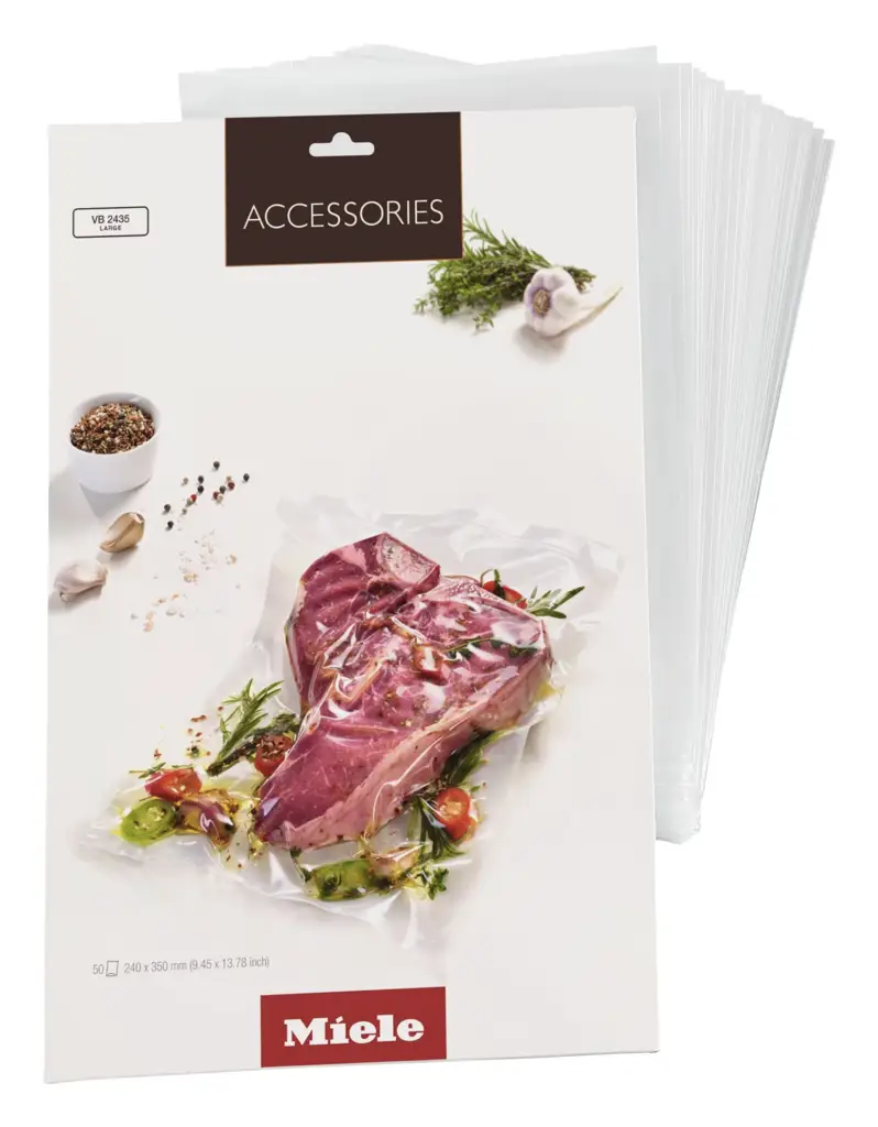 Duże torebki próżniowe 50 sztuk VB 2435 o wymiarach 240 x 350 mm. Idealne do gotowania sous-vide i pakowania próżniowego. Gładkie, odporne na rozerwanie - 90 µ. Przeznaczone do jednorazowego użytku. Nadają się zarówno do płynnych jak i stałych produktów spożywczych. Produkt pasuje do wszystkich szuflad do pakowania próżniowego Miele.