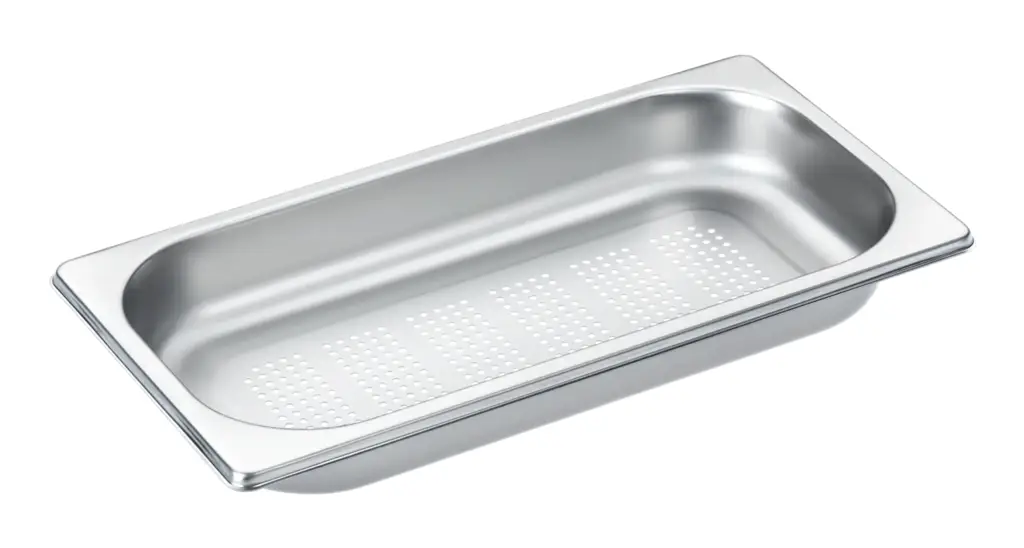 Pojemnik perforowany DGGL 1 od Miele to profesjonalne akcesorium z europejskiej produkcji o pojemności 1,5 L (pojemność użytkowa: 0,9 L) i wymiarach 32,5 x 17,6 x 4 cm (szer. x głęb. x wys.). Idealnie nada się do gotowania warzyw, ryb, mięsa i ziemniaków bez wody oraz rozmrażania produktów spożywczych. Produkt pasować będzie do wszystkich urządzeń do gotowania na parze DG od Miele oprócz DG 7000.