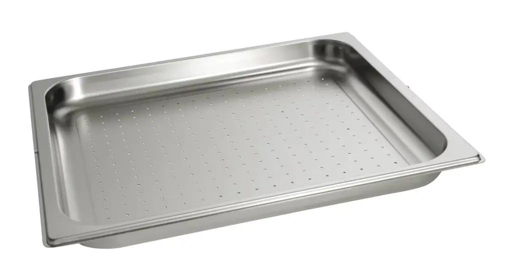Pojemnik perforowany DGGL 12 od Miele to profesjonalne akcesorium z europejskiej produkcji o pojemności 5,4 L (pojemność użytkowa: 3,3 L) i wymiarach 44,8 x 38,6 x 4 cm (szer. x głęb. x wys.). Wykonany ze stali szlachetnej - grubość ścianki 0,6 mm. Idealnie sprawdzi się do blanszowania lub gotowania warzyw, ryb, mięsa i ziemniaków itd.. Produkt pasuje do piekarników parowych Miele.