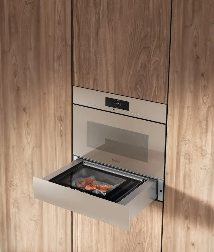 Bezuchwytowa szuflada do pakowania próżniowego Miele EVS 7010 w eleganckim odcieniu Perłowego Beżu i o wysokości 14 cm to praktyczny dodatek, który doskonale wpisuje się w nowoczesne aranżacje kuchenne. Umożliwia wygodne i skuteczne próżniowe pakowanie żywności, co pozwala na dłuższe zachowanie jej świeżości i doskonałe przygotowanie do gotowania metodą sous-vide. Szuflada świetnie sprawdzi się również podczas marynowania oraz ponownego zamykania różnych opakowań, takich jak słoiki. Wygodną i intuicyjną obsługę zapewniają nowoczesny panel dotykowy SensorTouch, system otwierania Push2Open oraz funkcja pełnego wysuwu.