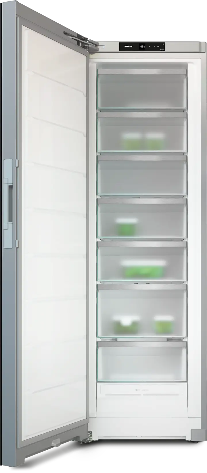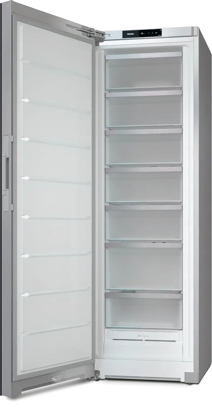 Dzięki funkcji SoftClose drzwi zamykają się cicho i delikatnie, eliminując ryzyko przypadkowego uchylenia i tym samym zapewniając optymalne warunki przechowywania żywności. Co więcej, dzięki możliwości podłączenia urządzenia do systemu Miele@home, możesz zarządzać zamrażarką z dowolnego miejsca za pomocą smartfona.
