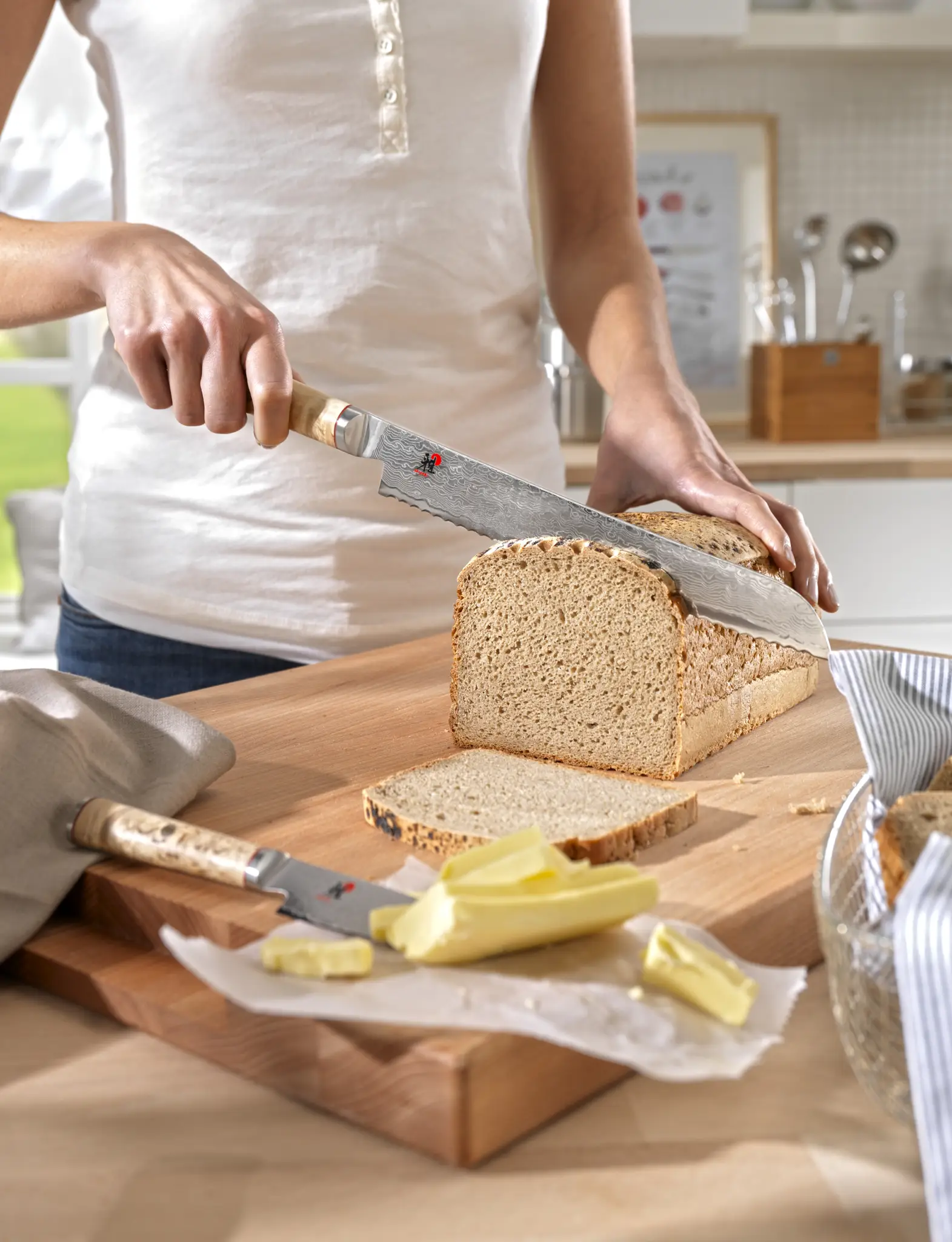 Przedstawiony nóż Nóż do pieczywa od marki Miyabi jest najwyższej klasy dziełem sztuki kulinarnej w dziedzinie krojenia pieczywa. Posiada charakterystyczne dla noży do pieczywa długie twarde ostrze a dzięki ostrej krawędzi nawet najbardziej chrupiąca, twarda skórka chleba nie będzie dla niego przeszkodą. Gwarantuje on optymalne właściwości tnące podczas codziennego użytku w kuchni. Nóż jest połączeniem tradycyjnego designu i funkcjonalności, ale też precyzyjnego, gładkiego cięcia.