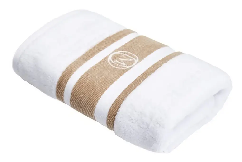 Prezentowany ręcznik kąpielowy z linii Linea ma wymiary 100 x 160 cm i gramaturę 650 gr/m2. Idealnie sprawdzi się na co dzień, podnosząc komfort kąpieli. Wykonano go z białej, odwójnie czesanej, wstępnie pranej bawełny frotte z żakardowymi paskami w aksamitnym splocie chenille w kolorze beżowym. Ręcznik posiada wszytą pętelkę do zawieszania w tym samym kolorze, która ułatwia przechowywanie na haczyku w łazience. Podwójne przeszycia i zamknięte rogi zapobiegają natomiast szybkiemu niszczeniu.