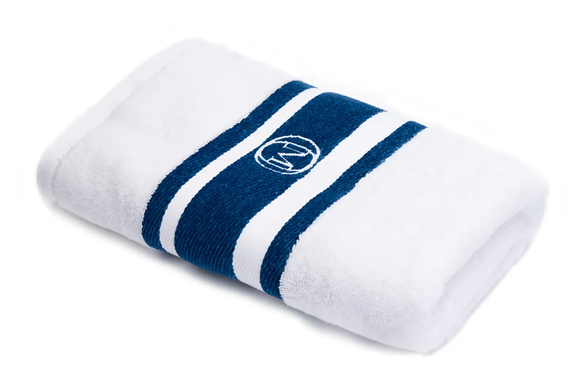 Prezentowany ręcznik kąpielowy z linii Linea ma wymiary 70 x 140 cm i gramaturę 650 gr/m2. Idealnie sprawdzi się na co dzień, podnosząc komfort kąpieli. Wykonano go z białej, odwójnie czesanej, wstępnie pranej bawełny frotte z żakardowymi paskami w aksamitnym splocie chenille w kolorze niebieskim. Ręcznik posiada wszytą pętelkę do zawieszania w tym samym kolorze, która ułatwia przechowywanie na haczyku w łazience. Podwójne przeszycia i zamknięte rogi zapobiegają natomiast szybkiemu niszczeniu.