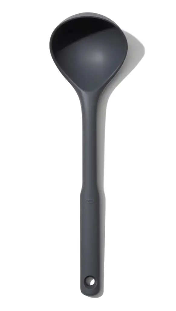 Prezentowana chochelka z linii Good Grips wykonana została z odpornego na działanie wysokiej temperatury silikonu w ciemnoszarym kolorze, dzięki czemu bez obaw będzie z niej można korzystać gdy potrawy są wciąż gorące. Sprawia to także, że nada się ona do używania z naczyniami pokrytymi powłokami nieprzywierającymi, nie powodując uszkodzeń i zarysowań na ich powierzchni. Chochelka idealnie sprawdzi się m.in. do nakładania sosów, potraw jednogarnkowych i zup, pozwalając na bezproblemowe nabranie ich i przelanie do innych naczyń. Wygodę podczas jej używania zapewni także komfortowy, nie wyślizgujący się z dłoni uchwyt. Dodatkową zaletą produktu jest możliwość czyszczenia go zarówno ręcznie jak i w zmywarce. Produkt posiada również niewielki otwór na końcówce rączki umożliwiający zawieszenie go na haczyku kuchennym - łatwe przechowywanie.