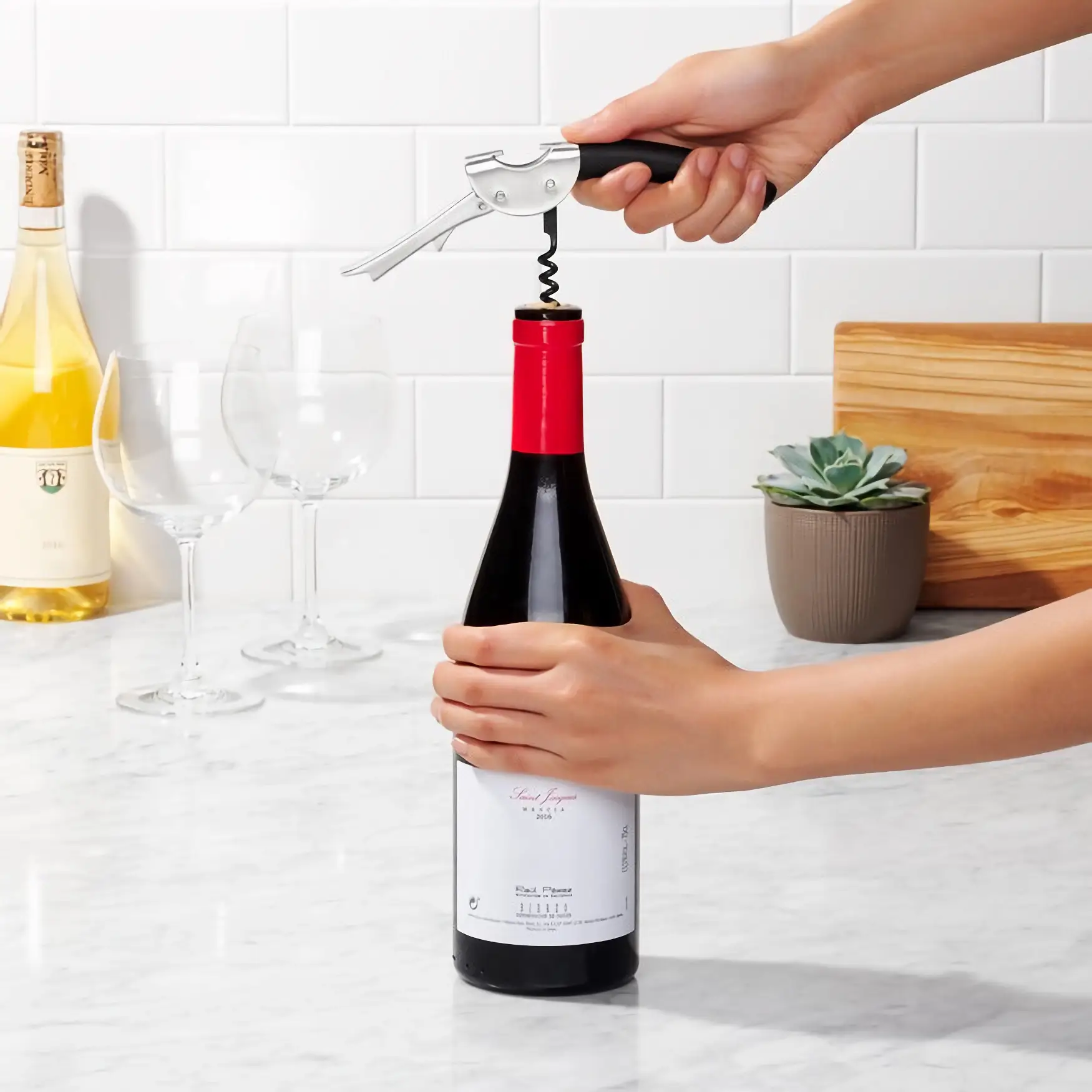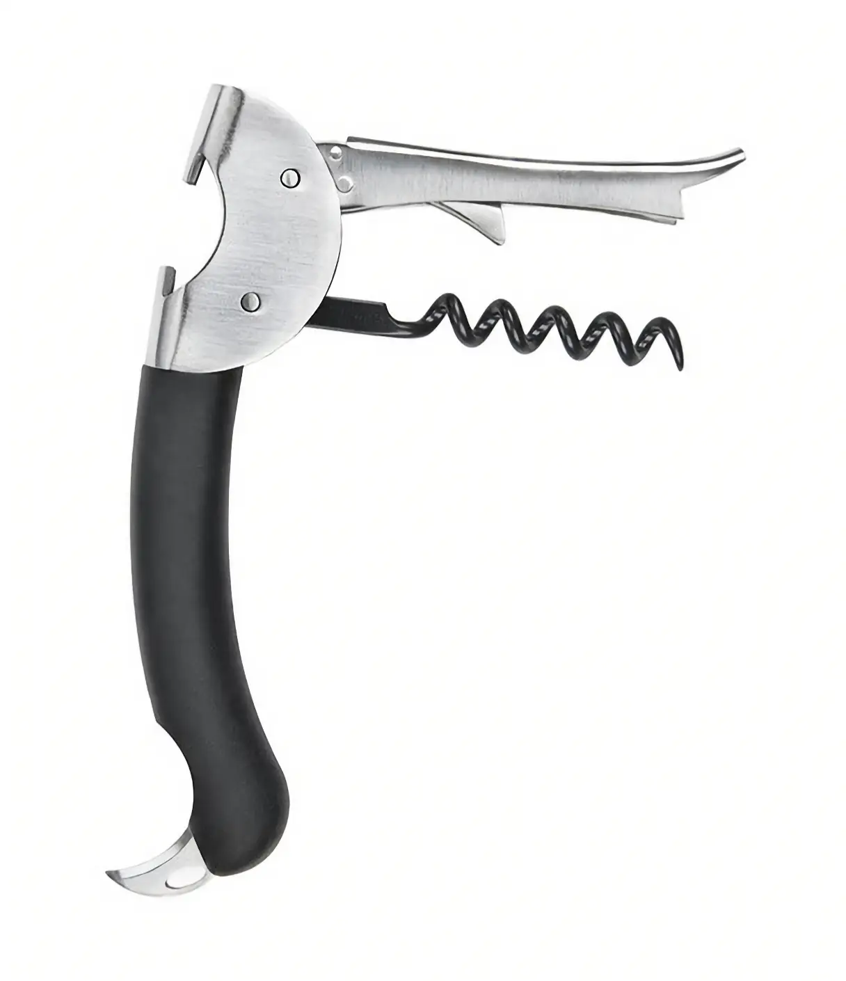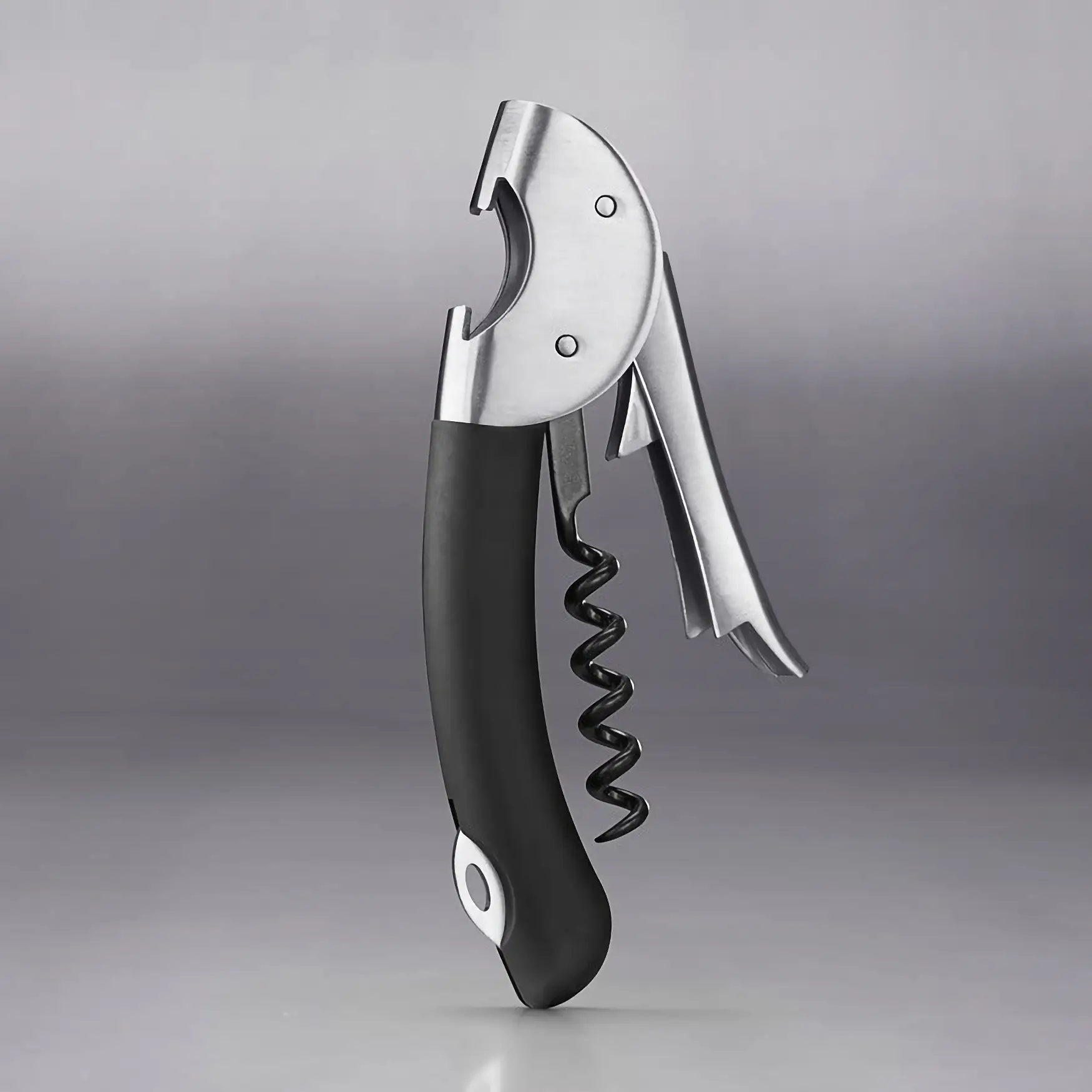 Prezentowany korkociąg kelnerski z kolekcji Steel wykonano ze stali nierdzewnej i tworzywa sztucznego w czarnym kolorze. Ma nowoczesny, uniwersalny design, dzięki czemu elegancko się prezentuje. Korkociąg działa na zasadzie podwójnej dźwigni, przez co jest łatwy w używaniu. Spiralę produktu pokryto nieprzywieralną powłoką, a uchwyt ma właściwości antypoślizgowe. Dodatkowo korkociąg posiada otwieracz do butelek i chowany w rączce nożyk do folii, co zwiększa możliwości jego zastosowania. Produkt należy myć wyłącznie ręcznie.