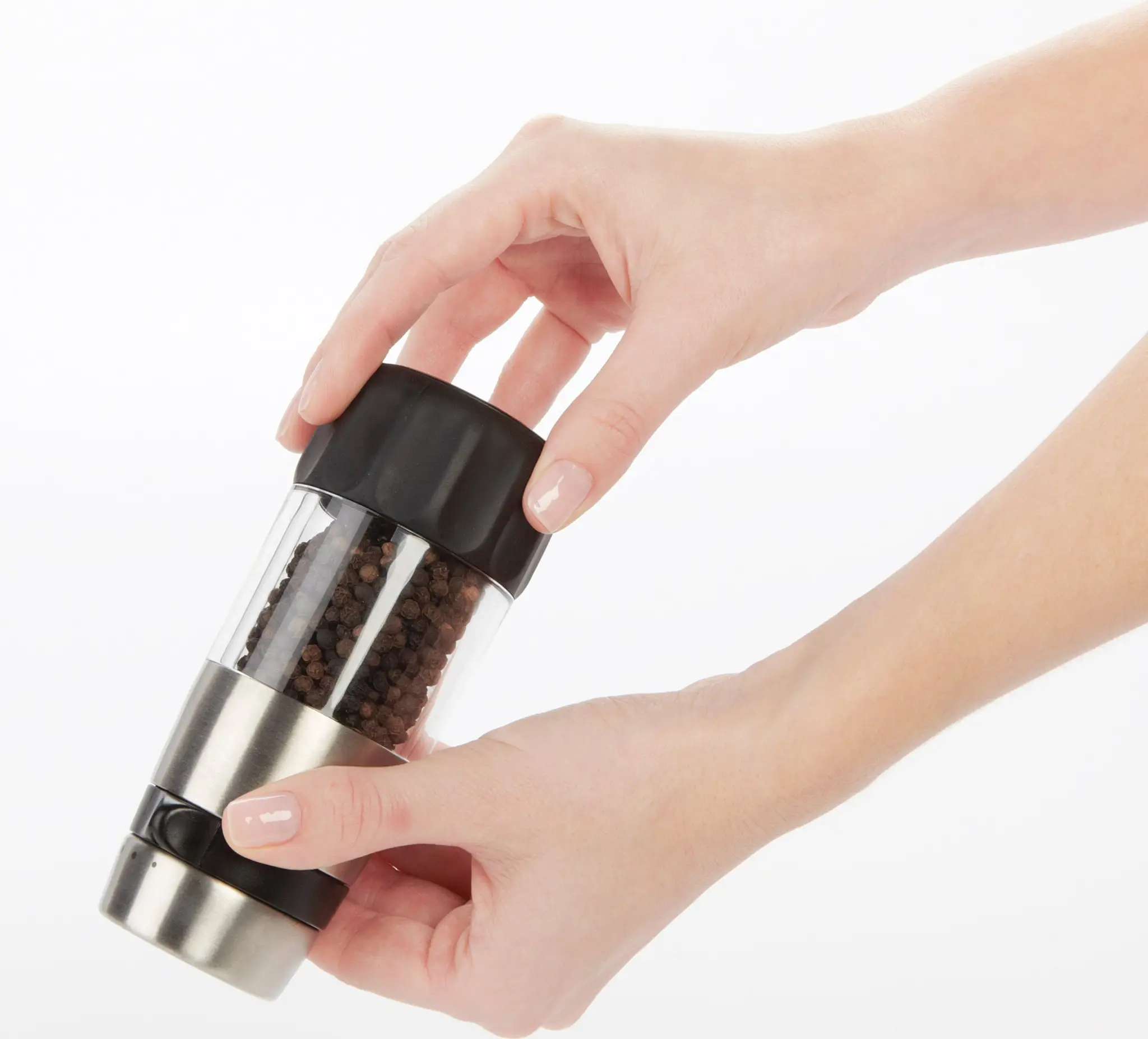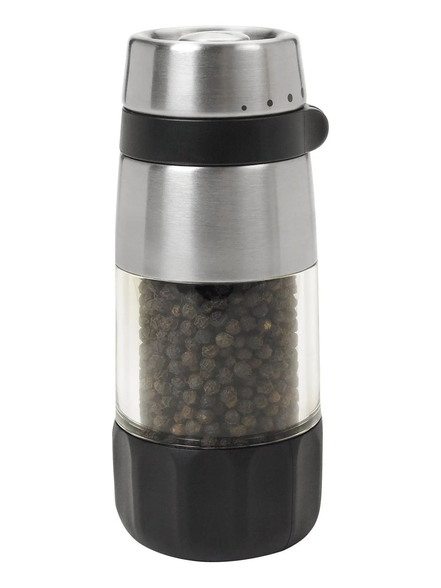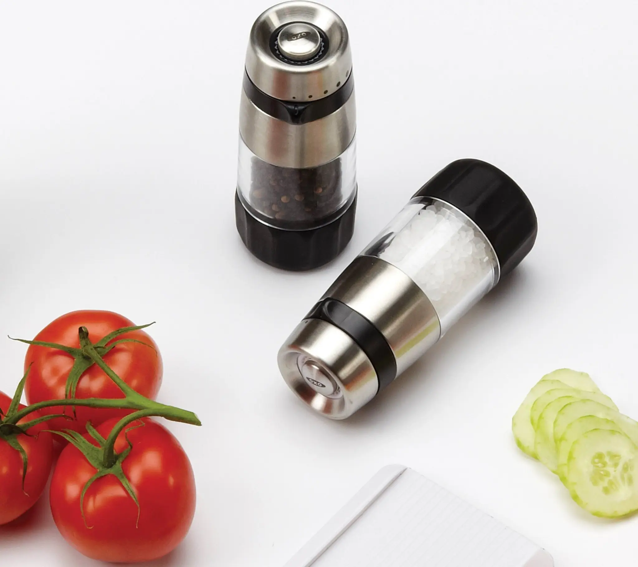 Nierdzewne młynki do przypraw z kolekcji Good Grips marki Oxo to młynki o eleganckim, a zarazem praktycznym charakterze. Wyposażone w ceramiczny mechanizm z regulacją grubości przemiału, wykonane zostały ze stali nierdzewnej i akrylu. Przezroczyste pojemniki na przyprawy eksponują zawartość, a wygodne uchwyty sprawiają, że młynki pewnie leżą w dłoni. Wygodna konstrukcja charakteryzująca się umieszczeniem mechanizmu mielenia na wierzchu młynków sprawia, że młynki nie brudzą powierzchni blatu, czy stołu.